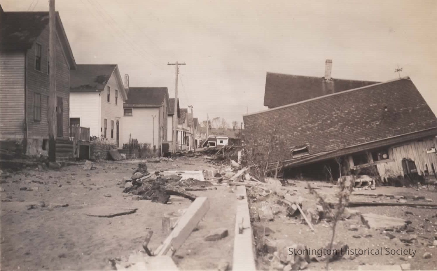 black and white photo postcard of damage from the 1938 Hurricane along Hancox Street in Stonington Borough.