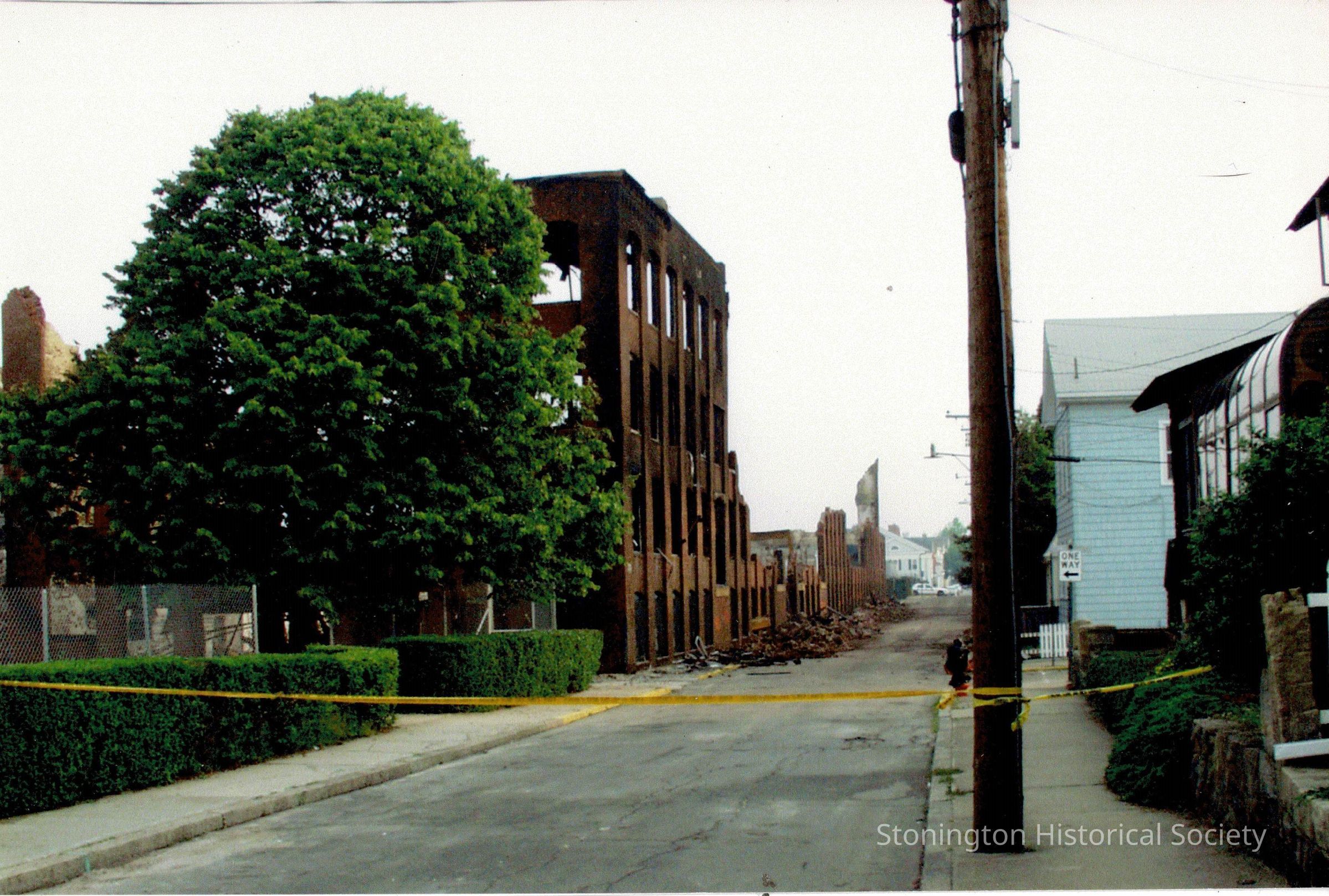Photograph taken after the Atwood/Monsanto fire of July 3, 2003, looking north up Water Street. Contractors were working to renovate the old factory into luxury condominiums - Stonington Commons. This photograph shows the damage from the fire, a few days after. Water Street is still taped off to traffic.Collection