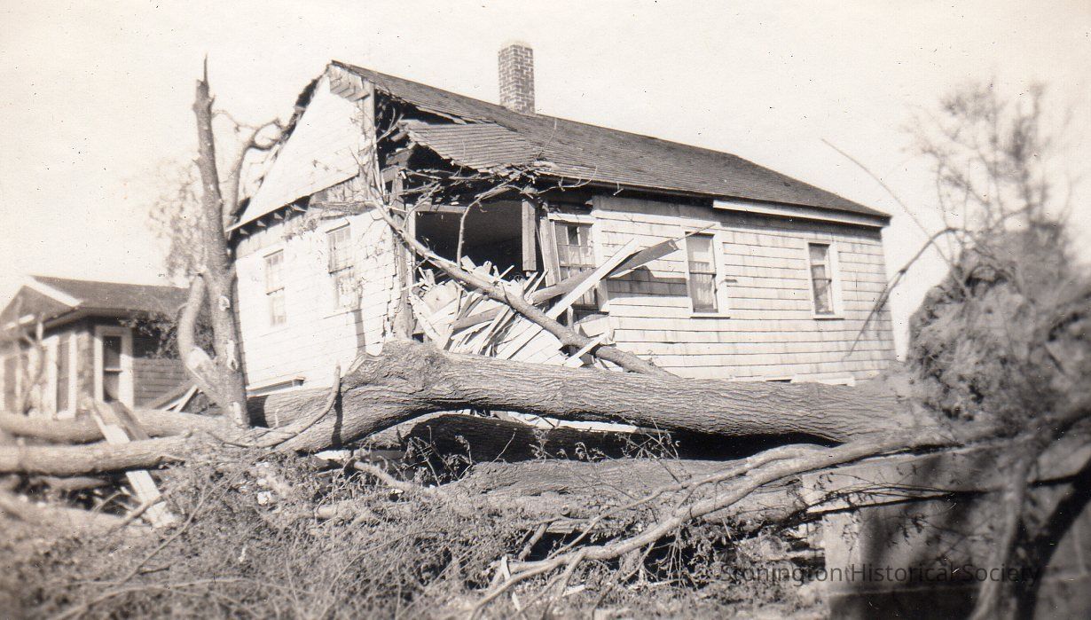 Black and white photograph of damage to a house on Main Street following the 1938 Hurricane. From photograph album of Bertha D'Amico.
