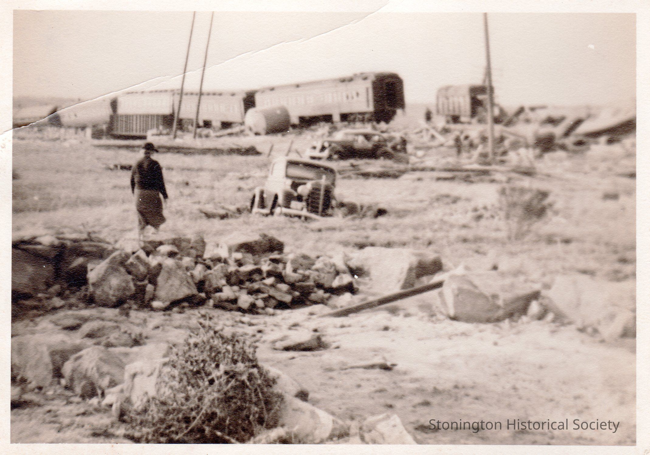 Black and white photograph, 1938 Hurricane damage, New Haven Line/train, Stonington.