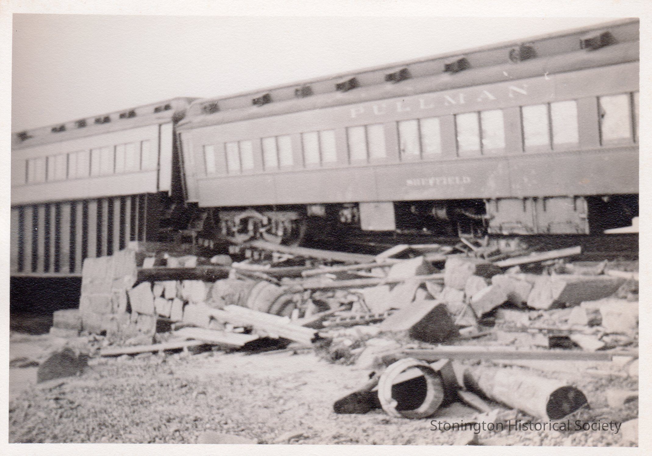 Black and white photograph, 1938 Hurricane damage, train derailment, Stonington.