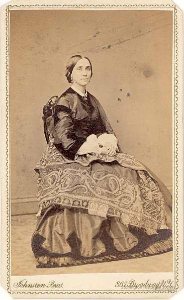 Seated full-length photo unidentified woman in dark silk dress with paisley shawl.
