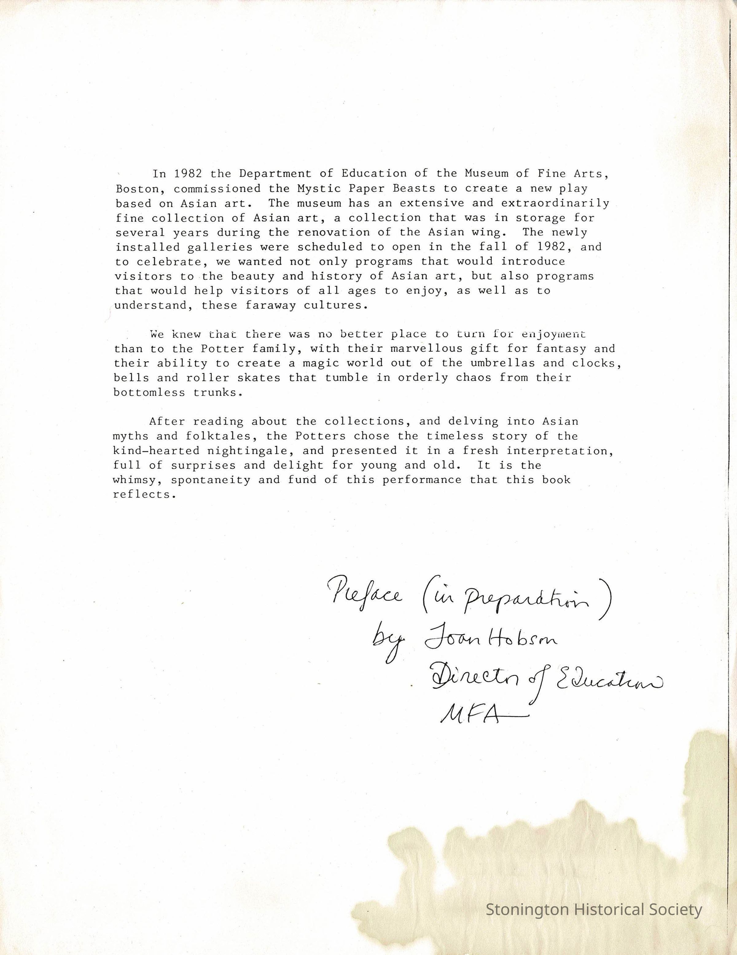 A preface to the children's book that was to be created from the photographs in this collection. The preface was written by Joan Hobson, Director of Education at MFA. (not sure which one). This book was supposed to be a retelling of a traditional Asian folktale about the kind-hearted nightingale.Collection