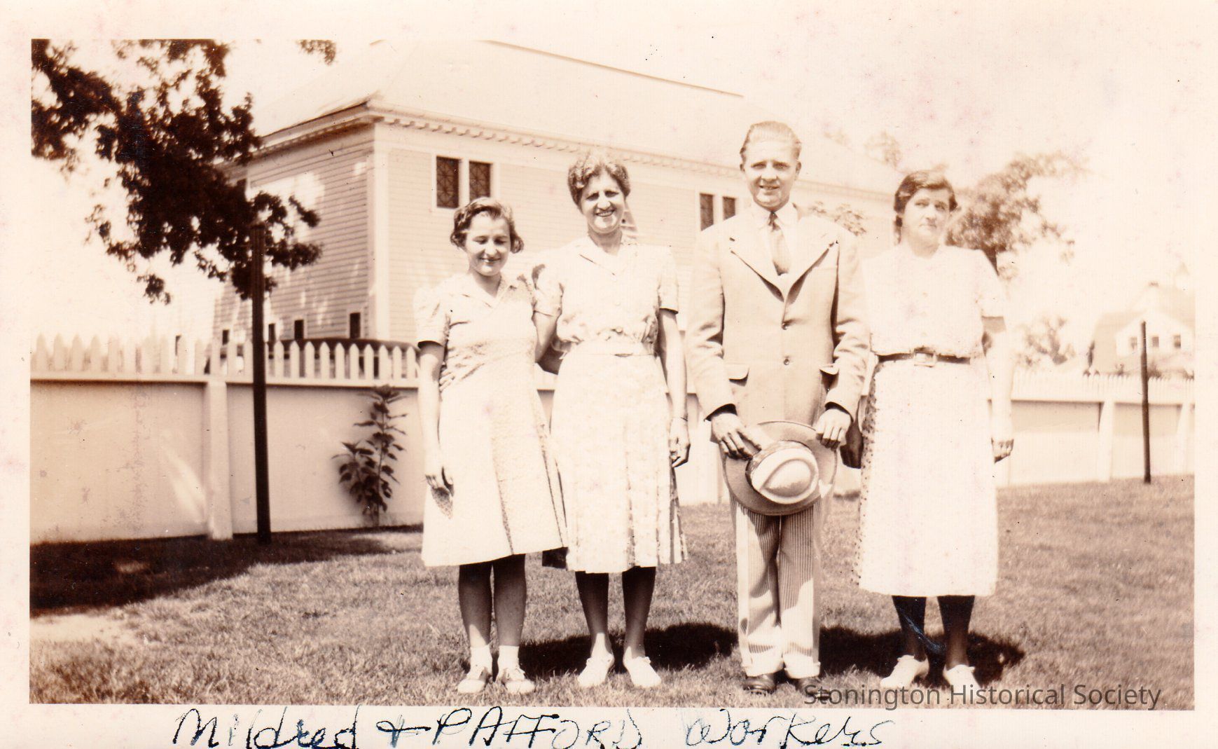 black and white snapshot, workers employed by the Paffard family at Stone Acres, c. 1941. Left to right - Mildred, Millie, Henry, Julia