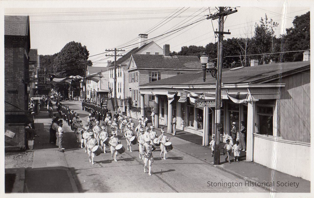 7 black and white photographs of a parade in Stonington Borough, printed on postcards. Handwriting on the back indicates that the photographs may have been taken August 10, 1924. But they were most likely taken in 1935. Photographs show the parade marching down Water Street. The arcade building and C.E. Staplin's Fish Market.