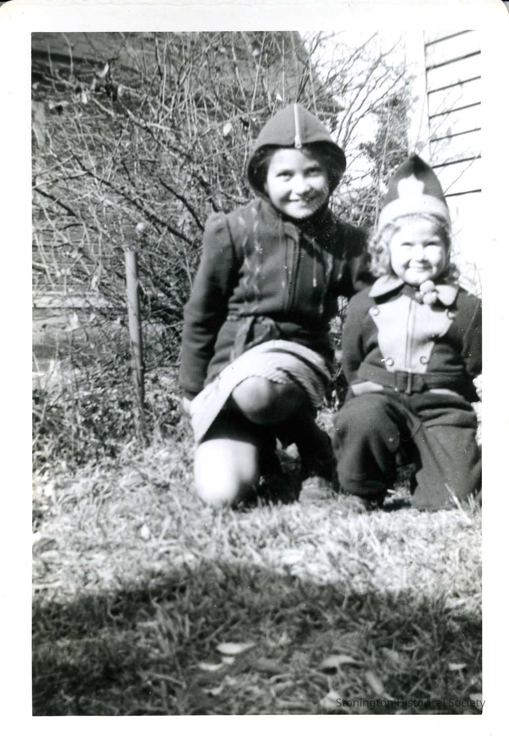 A small black and white photograph of what appears to be two little girls. One is slightly older, and this may be Carolyn Janet Clark. She has on a dark coat with a zippered hood. A much younger child is kneeling beside her in some sort of winter suit.Collection