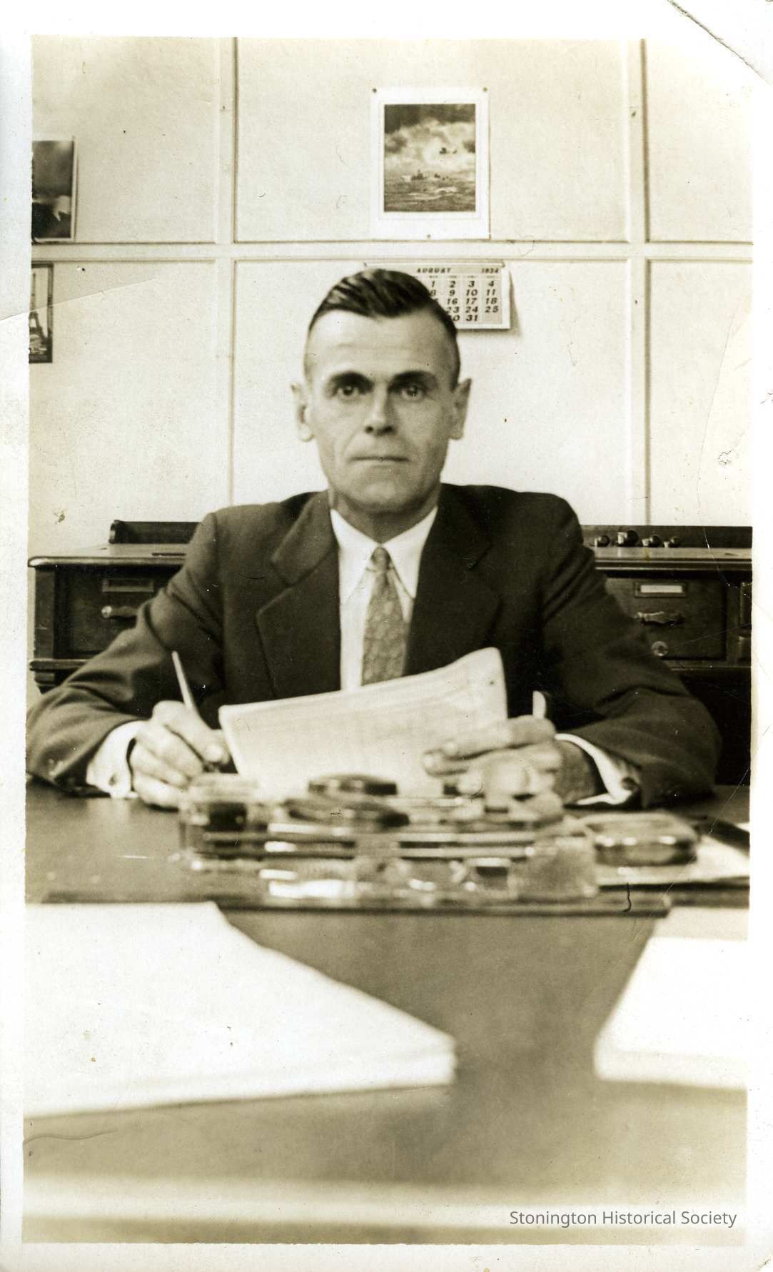 A black and white portrait photograph of man who may be Merton Perry Clark, seated a desk. He is looking directly at the camera and is holding a paper and pen. Behind him on the wall the calendar reads August 1934.Collection