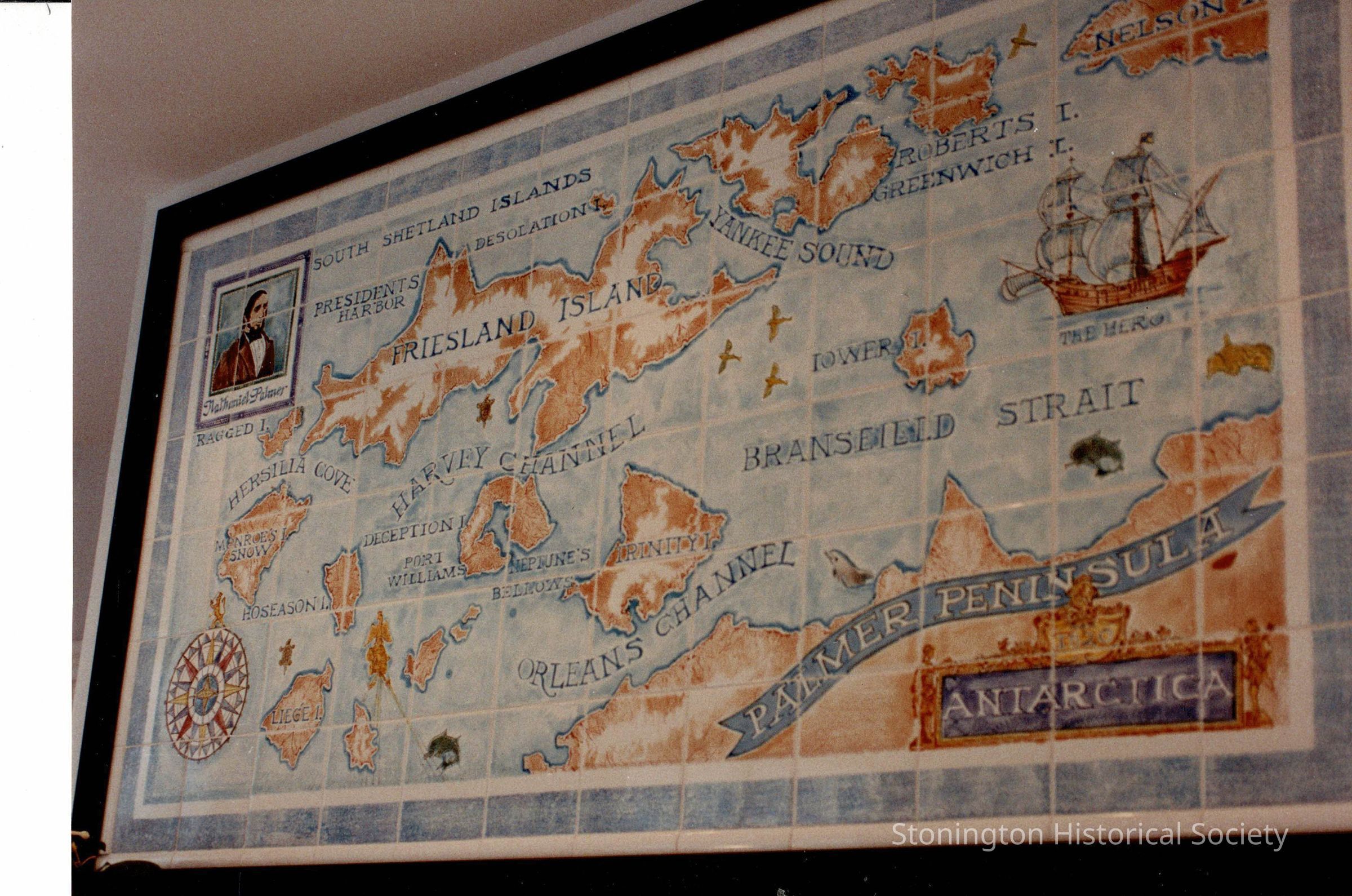 A view of the tile mural in the Captain N.B. Palmer House kitchen, created in 1989 for the Designer's Show House. The kitchen was designed by Spectrum Design, Inc of Guilford, CT. The painted tile mural was done by Robert Diesso. (As of 2024, this is remains in the kitchen)Collection