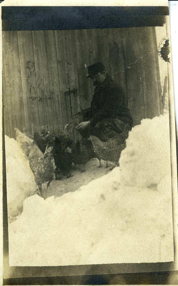 A small black and white photograph of a man kneeling outside in the snow, feeding chickens. He is wearing a dark coat nad hat. There is graffitti on the wooden wall he is beside. Back of the photograph reads "Elisha feeding chickens."