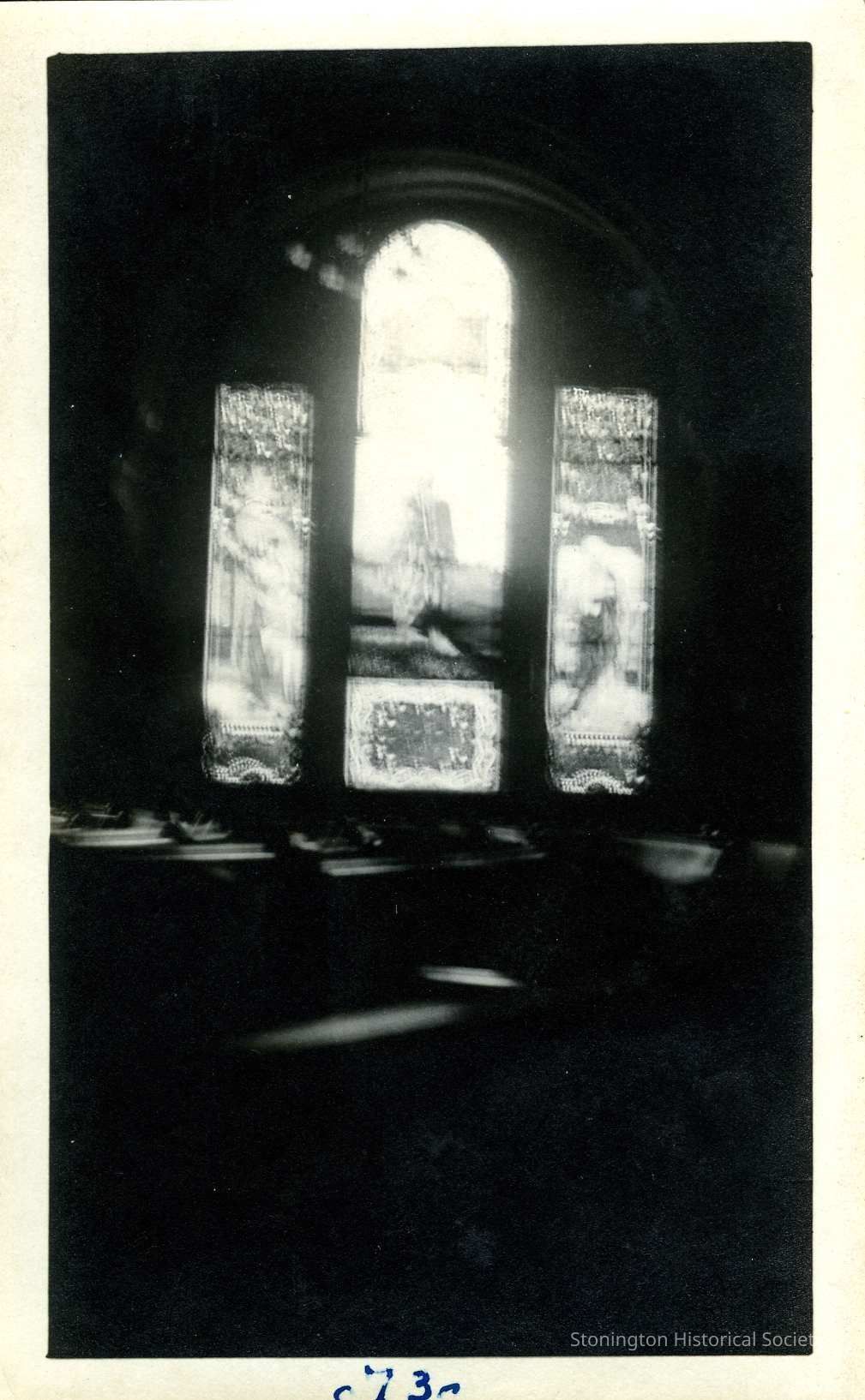 A black and white photograph of the stained glass windows in a church. Photogrpah is blurry so images are not decipherable. Reverse side of photograph reads: "window in Baptist Church, Stonington. North Windows."Collection