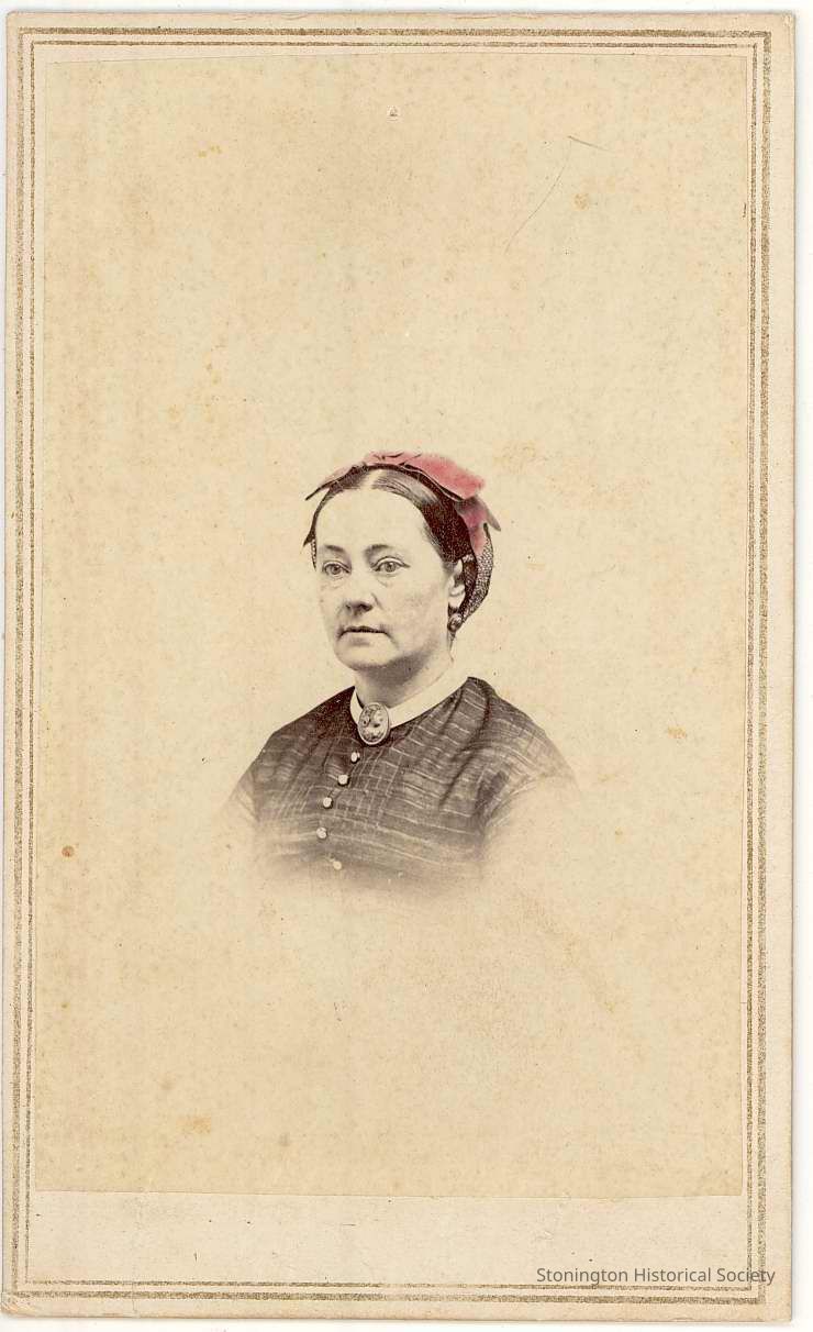Head and shoulders portrait of Catherine E. Anderson wearing striped silk dress and cap with hand-colored red bow