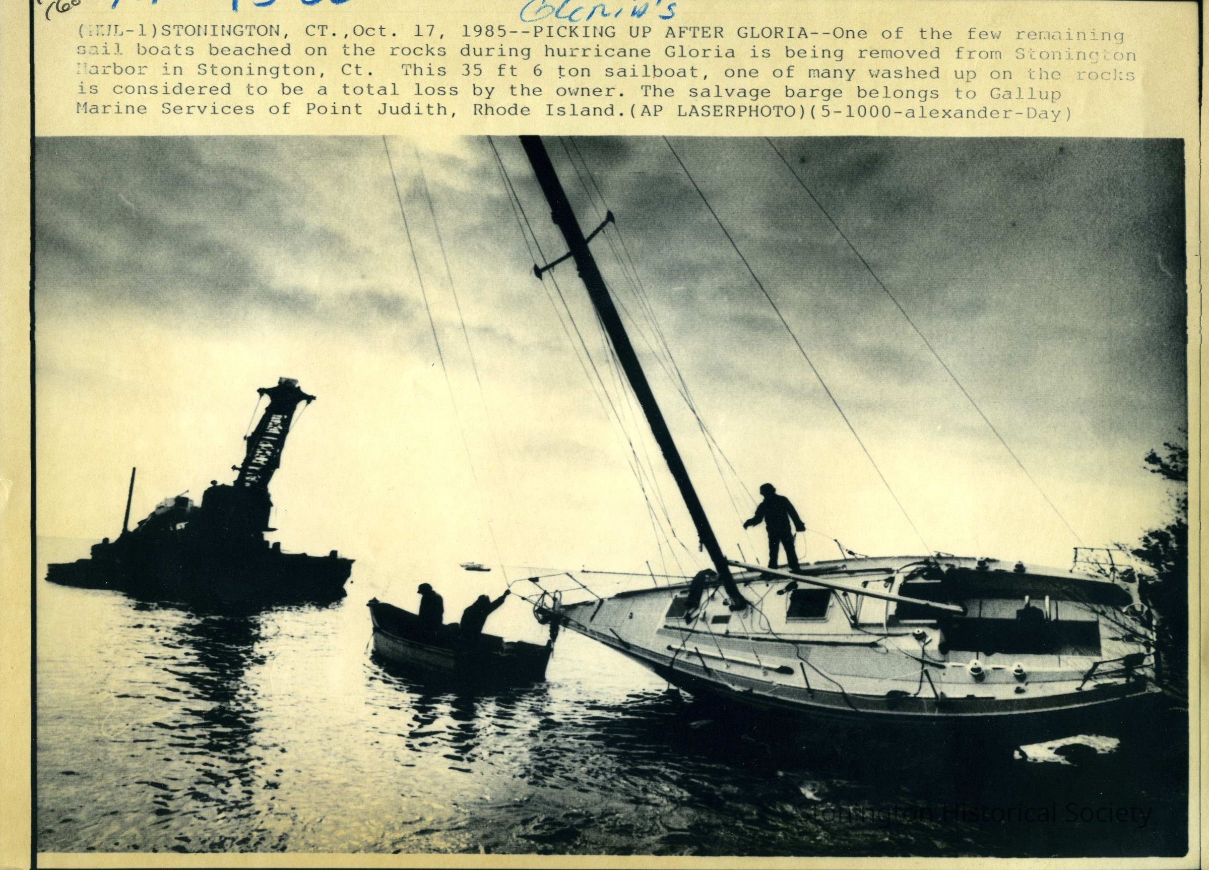 A large black and white photograph showing a ship in Stonington Harbor, stuck on the rocks. The caption reads: "Stonington, CT., October 17, 1985 - Picking up after Gloria - One of the few remaining sail boats beached on the rocks during hurricane Gloria is being removed from Stonington Harbor in Stonington, CT. This 35 ft 6 ton sailboat, one of many washed up on the rocks is considered to be a total loss by the owner. The salvage barge belongs to Gallup Marine Services of Point Judith, Rhode Island."Collection