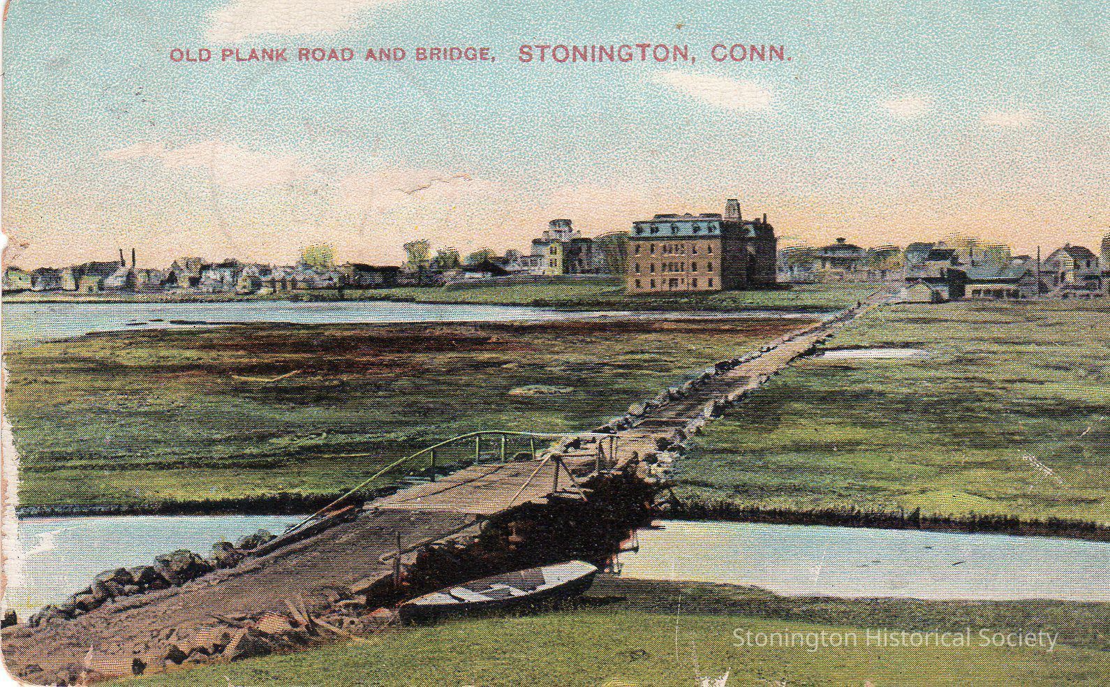 Color postcard, "Old Plank Road and Bridge, Stonington, Conn." View of Salt Acres Road looking towards Stonington Borough.