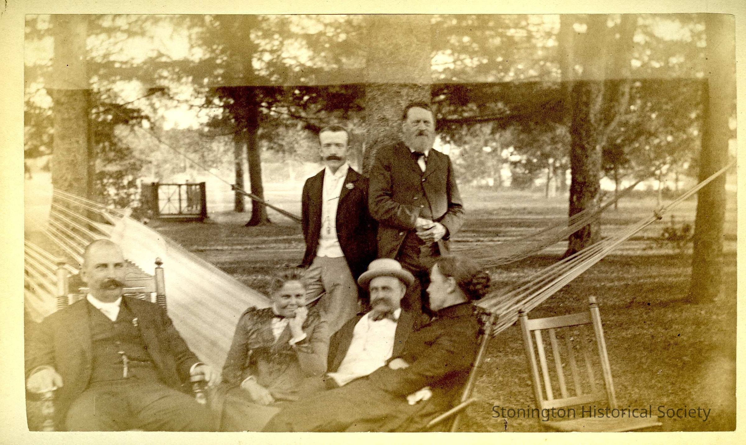 A photograph of a group of people in the front yard of Stone Acres. There are two hammocks and some chairs and a four men and two women are talking together. Photograph is probably around 1910 judging by the clothing. The younger man standing beside the tree at center could be Eugene Phelps Edwards.Collection