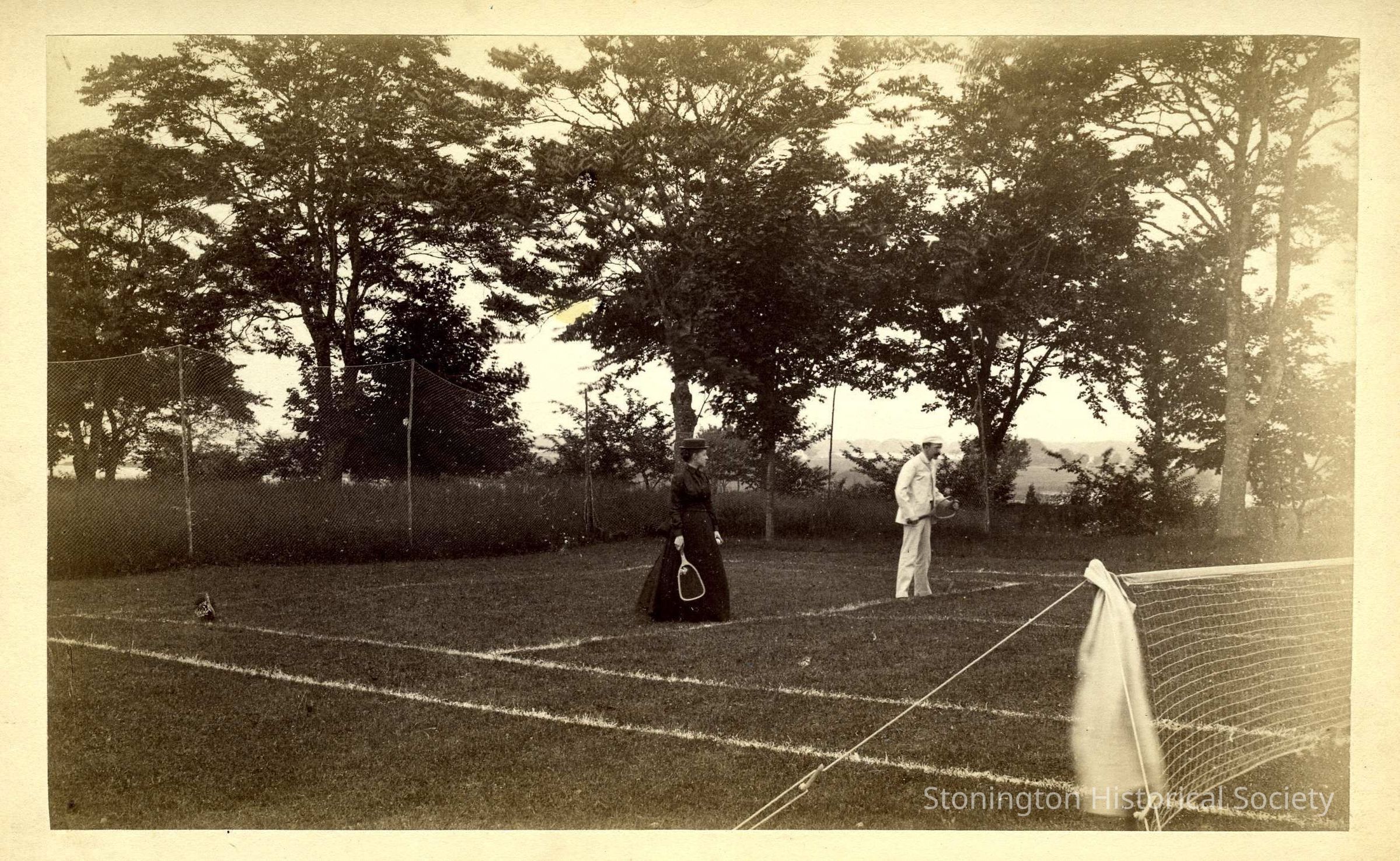 A photograph of a couple on a lawn tennis court. The woman is in a dark dress and the man is in a white suit. Time period appears to be closer to 1900 than 1920 due to the clothing. The couple is unidentified but the tennis court is on the grounds of Stone Acres Farm.Collection