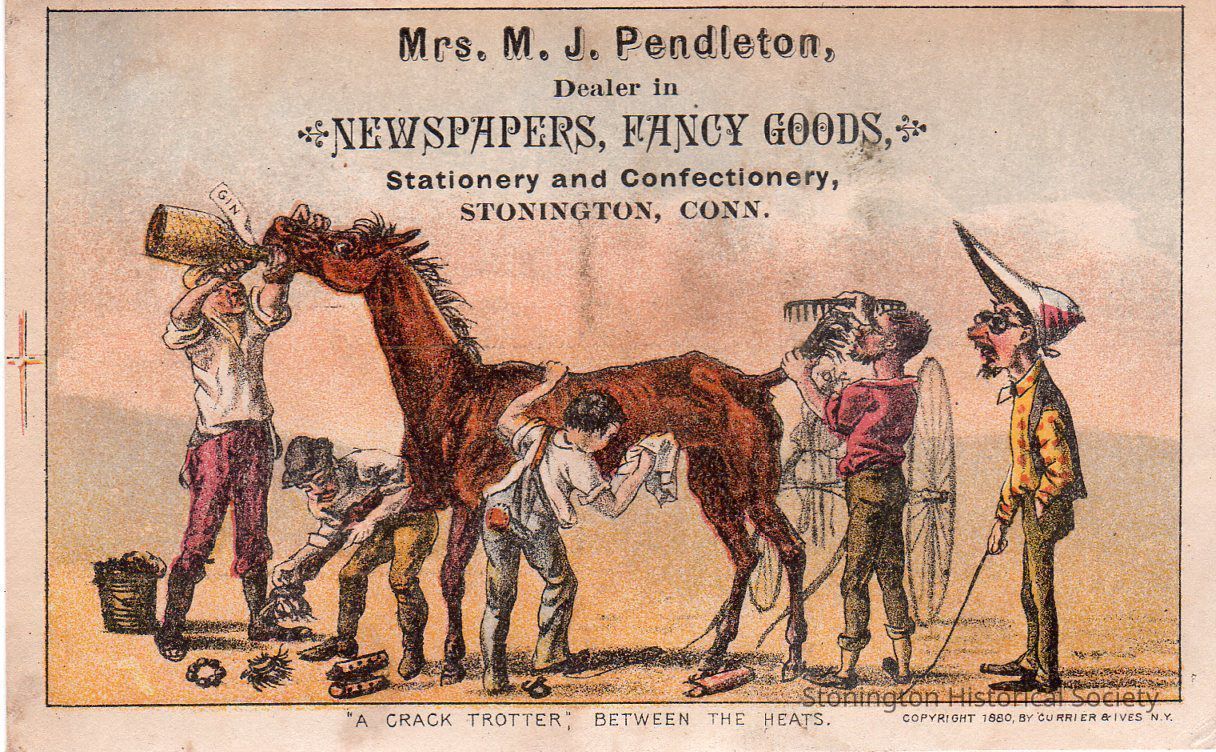 Trade Card, "Mrs. M.J. Pendleton, Dealer in Newspapers, Fancy Goods, Stationery and Confectionery, Stonington, Conn." Mrs. M.J. Pendleton had a newsstand at 133 Water Street, Stonington Borough.