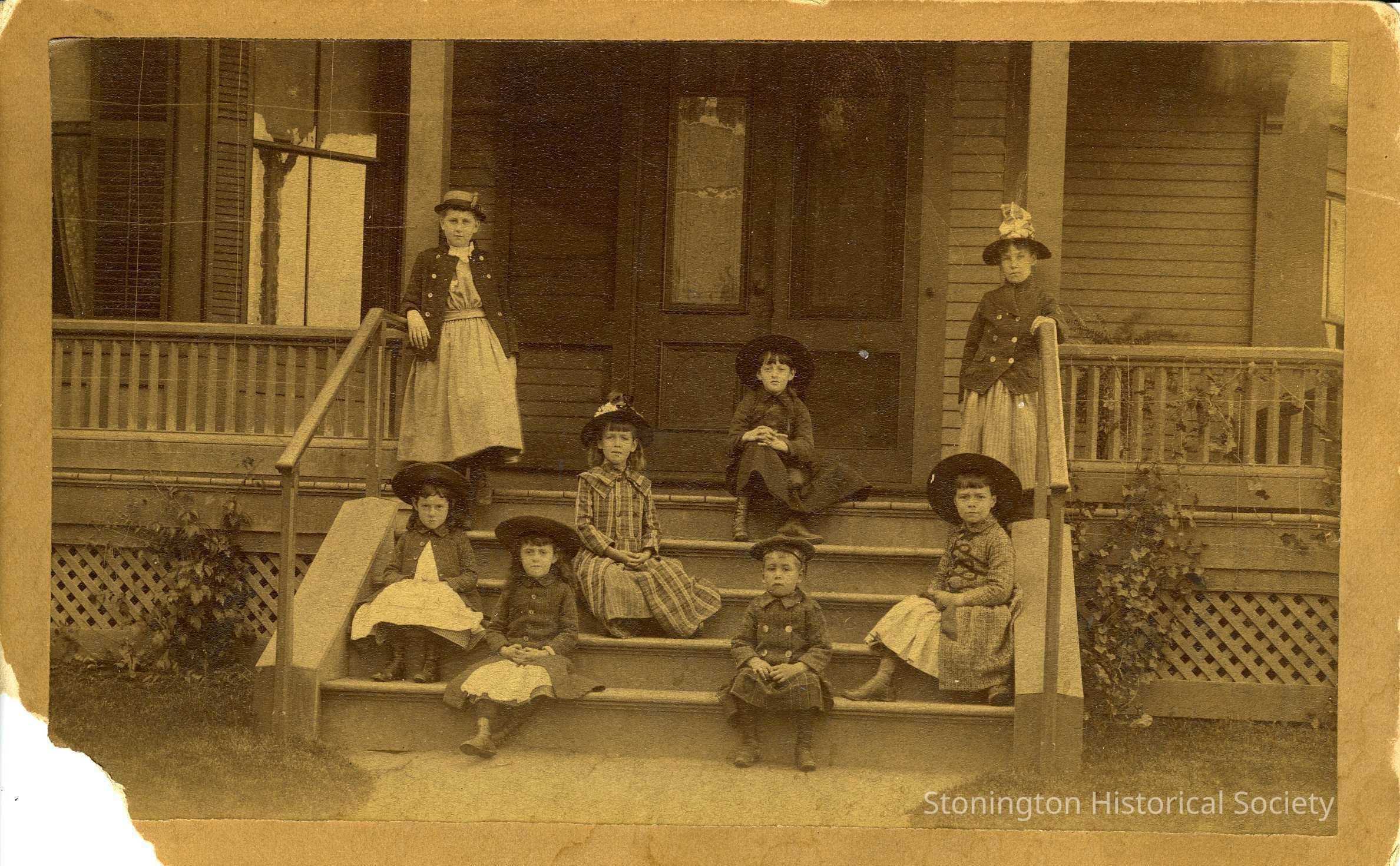 A photograph of a group of children on the front steps of a house. It is not Stone Acres. None of the children are identified, but may be Adams, Paffards, or Edwards children. The back of the photograph is dated June 1890.Collection