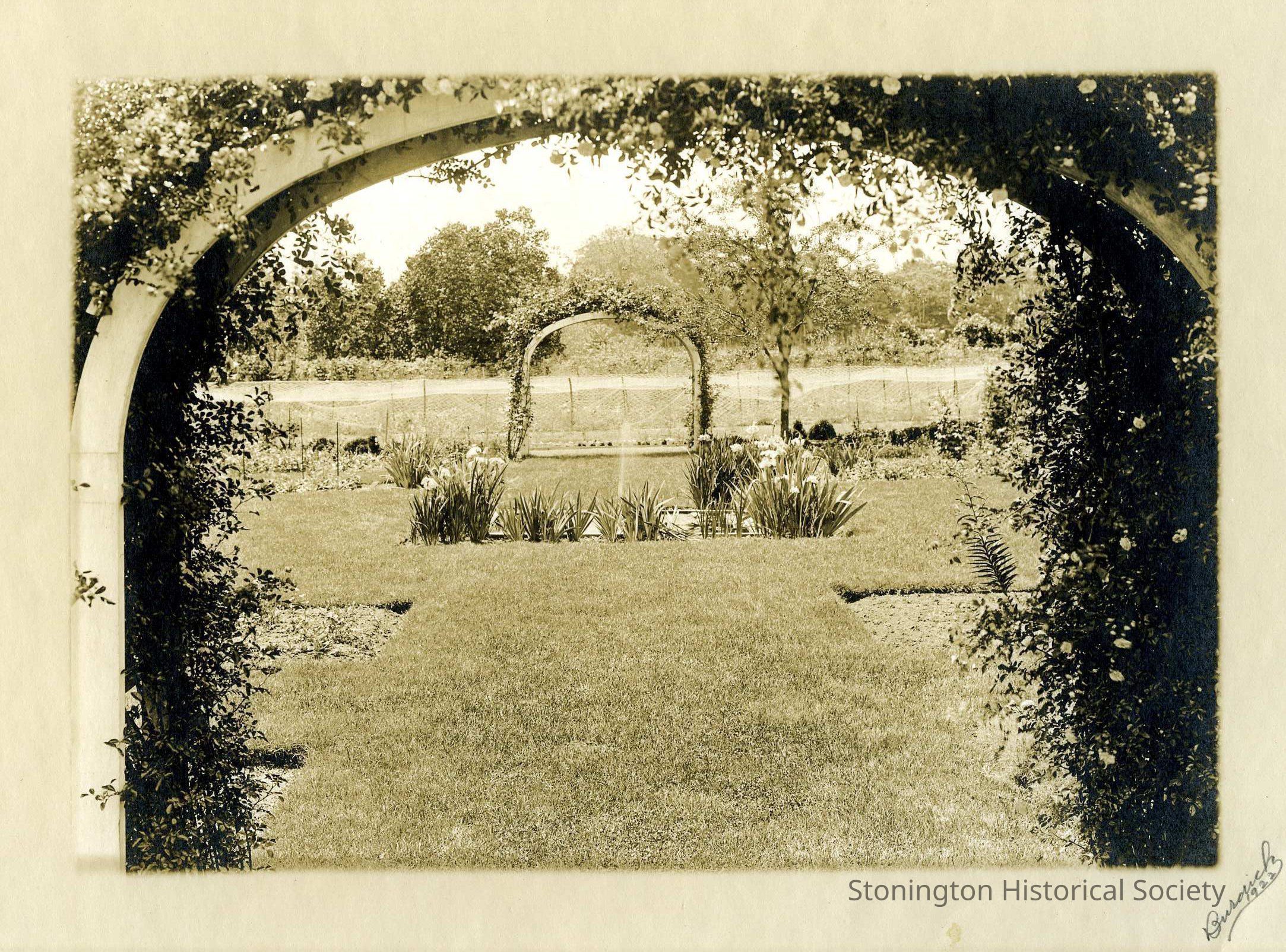A photograph taken through a floral archway at Stone Acres. It shows a view of the gardens, some covered by netting, a small pond with a foundation surrounded by lilies, and a matching floral arch across the grass. The bottom left of this photograph is signed by Burdick and dated 1922, beneath that is written 1934. Probably a 1934 copy of an earlier photograph.Collection