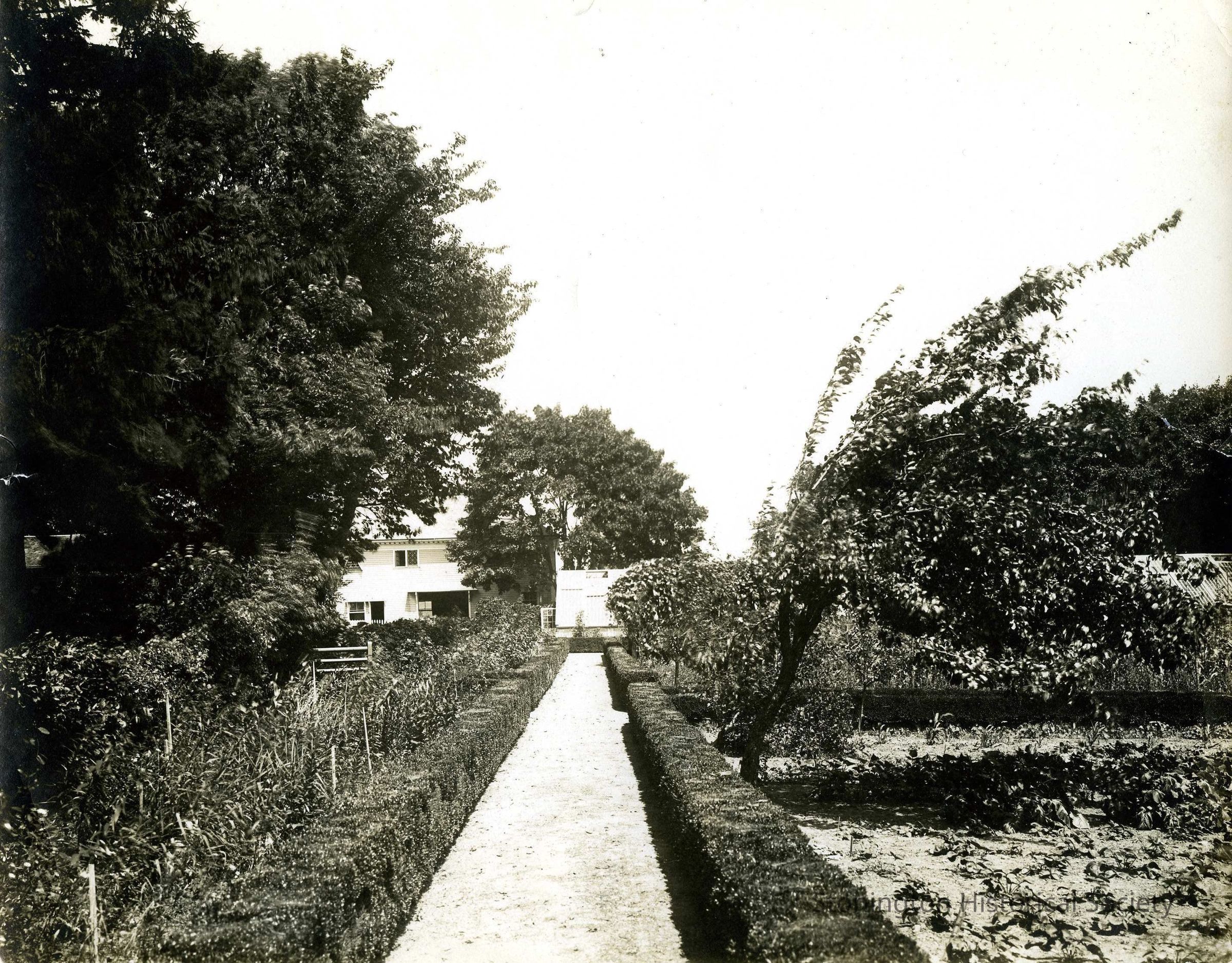 A photograph of the gardens at Stone Acres Farm. The pathway and gardens pictured here are on the east side of the main house and toward the rear. At the end of the pathway the greenhouse/grapery is visible. A row of low hedges lines the pathway and rows of plants and trees are on either side.Collection