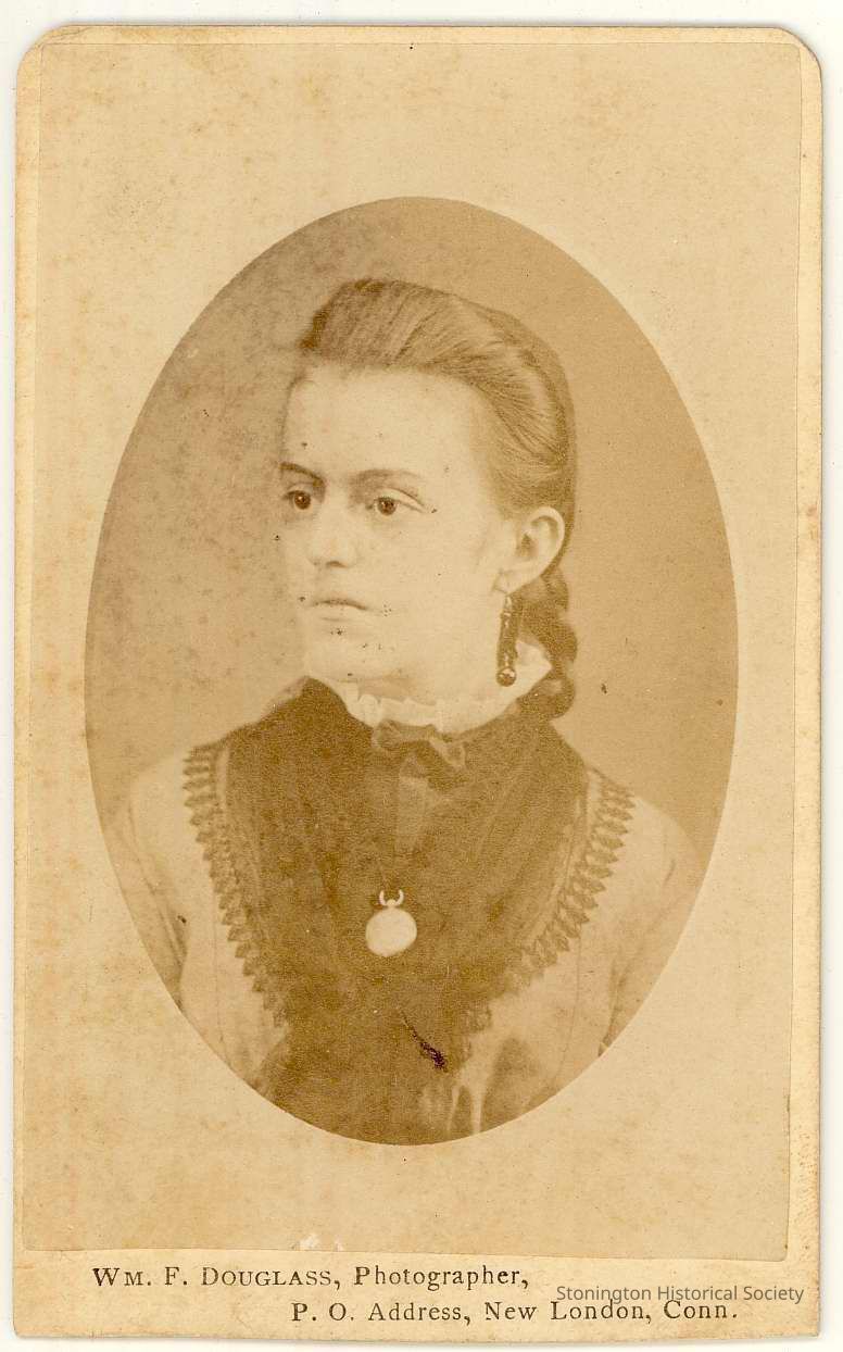 Oval matted photo of head and shoulders of "Carrie Bottum, school teacher"