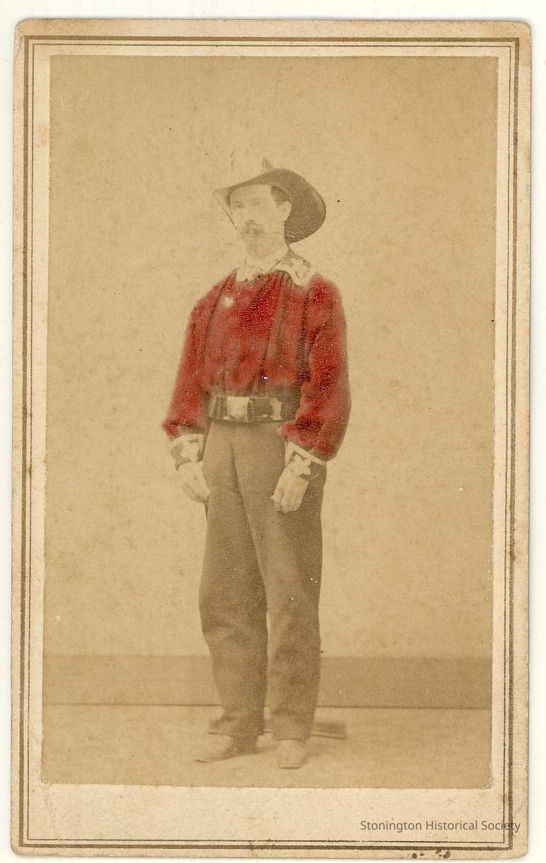 Full length standing man in fireman's uniform "Henry Hancox d. New London 8 Jul 1888 age 50"