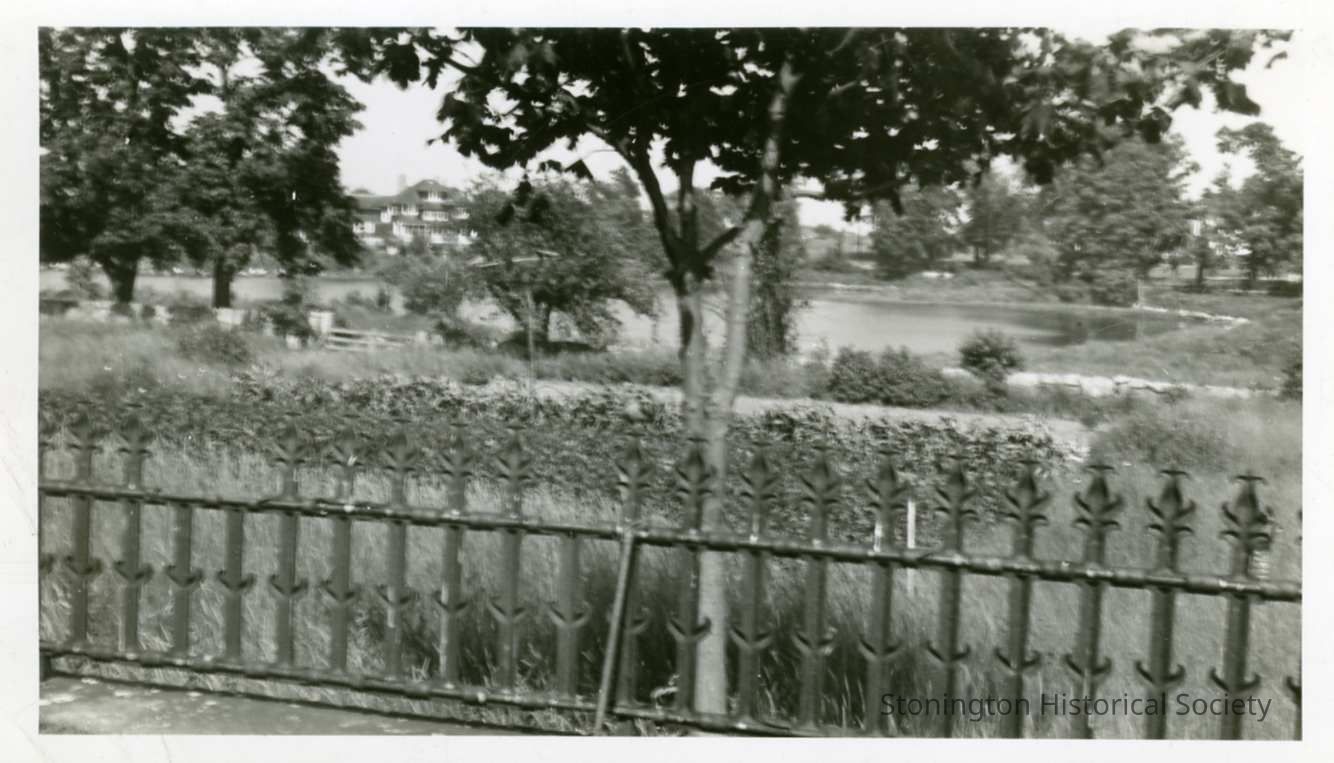 A small, black and white photograph of the east lawn of the Captain Nathaniel Palmer house. This photograph was taken from the upper lawn, by the circular drive in front of the house, looking east over the corn and cove. A large house is visible across the cove, possibly Grey Knoll.Collection