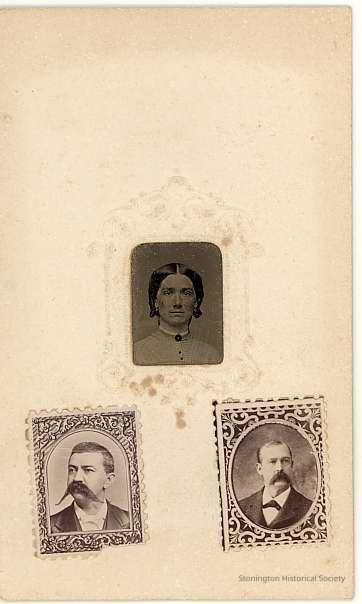 4 x 2 1/2 card with 1 x 3/4 tintype of unidentified woman 2 stamp style. 1 x 3/4 photos of 2 unidentified men glued to lower part of card