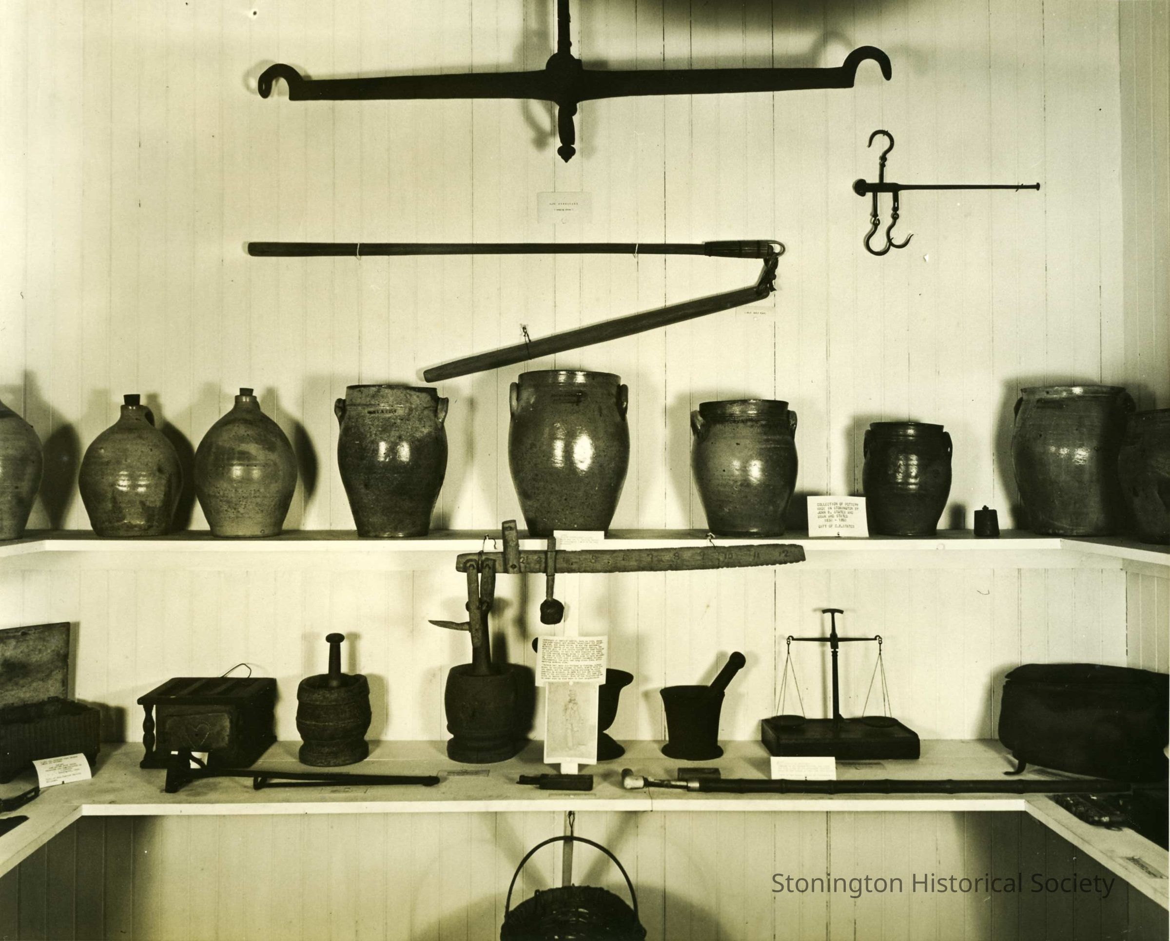An 8x10 black and white photograph of the northeastern exhibit room in the Lighthouse Museum. On display are a number of pieces of States pottery, as well as other small artifacts including a bed warmer, scales, mortar and pestles and walking sticks. Reverse of the photograph is stamped with Frank Jo Raymond.Collection