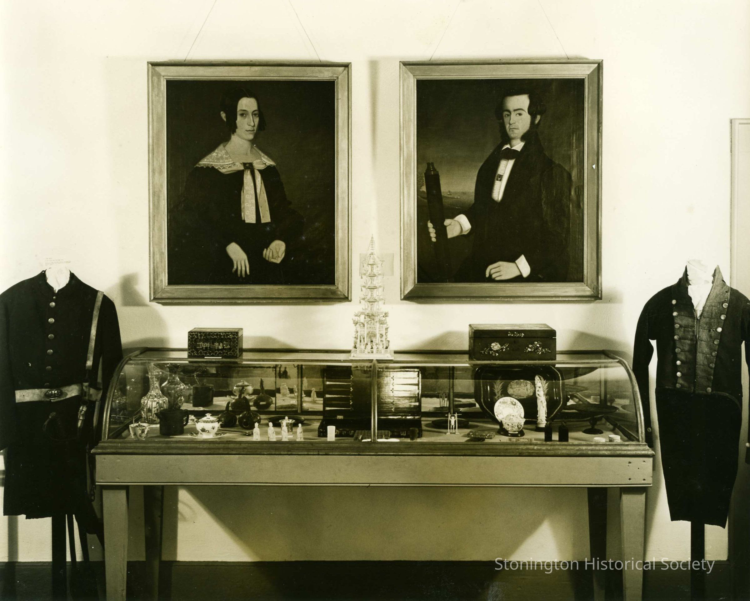 An 8x10, black and white photograph taken by Frank Jo Raymond, of a display inside the Lighthouse Museum, probably in the 1940s. The photograph shows a portrait of a sea captain and his wife (William Brewster) over a glass display case full of China trade goods. On either side of the glass case are mannequins wearing men's clothing.Collection