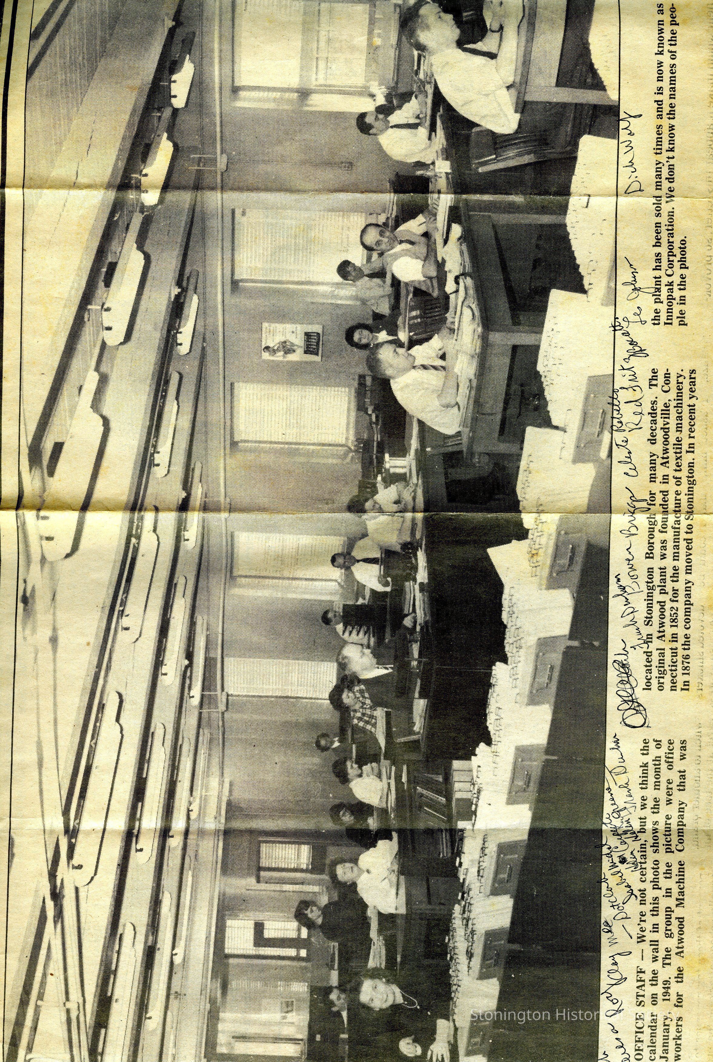 News clipping from The Westerly Sun, April 24, 1990, column "The Good Old Days Are Back! Down Memory Lane in Greater Westerly," shows a picture of the office staff at Atwood Machine Co., c. 1949.