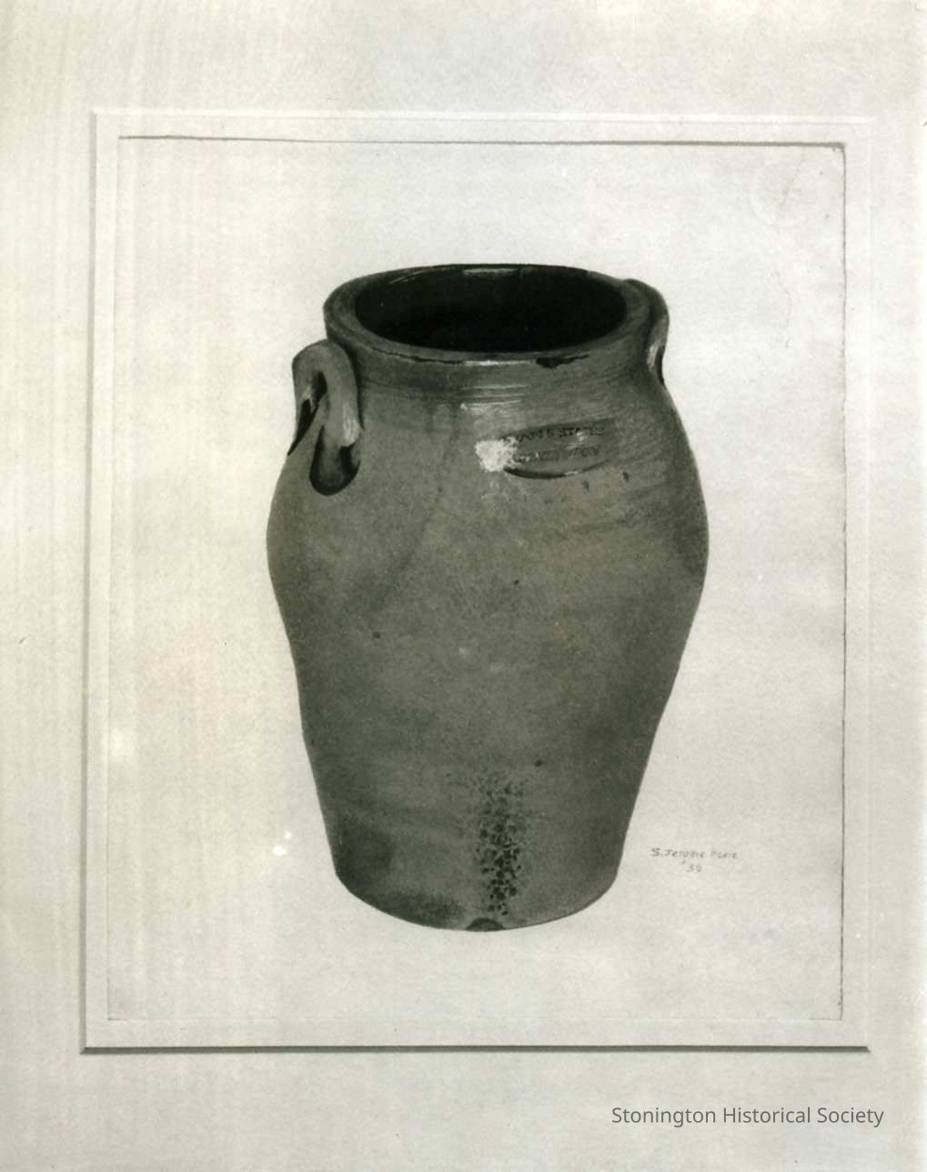 A small reproduction of a watercolor painted by S. Jerome Hoxie in 1936. The butter crock is one made by the States pottery in Stonington. The watercolor was painted for the Index of American Design. This photograph given by George L. Campbell.Collection