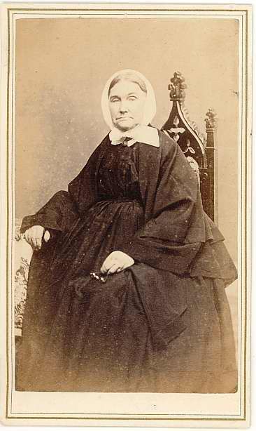3/4 seated photo of unidentified woman in black dress and white bonnet, holding glasses