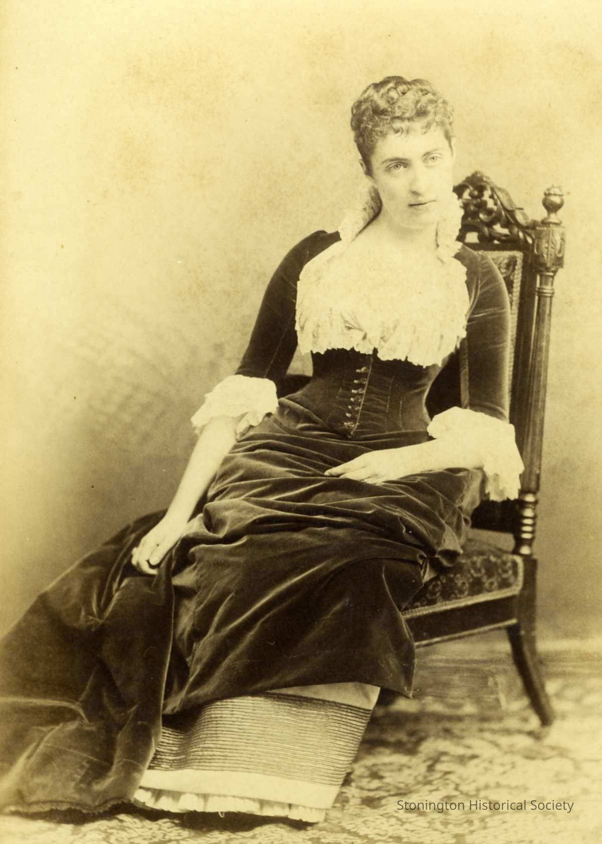 A portrait photograph of Mrs. Daisy Williams Warren, seated in a low chair. She is wearing what appears to be a dark colored velvet dress. Daisy was a nickname for Georgia Whitney Williams, who married George Henry Warren in 1885. Her father was Charles P. Williams and her mother was Georgia Babcock.Collection