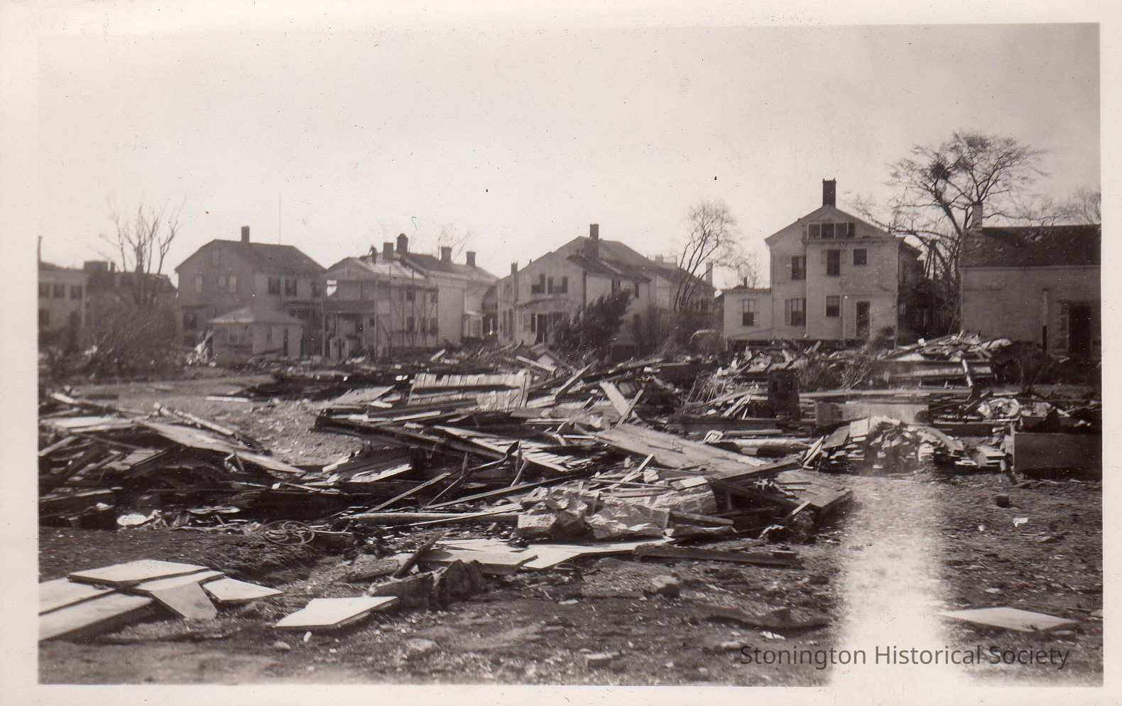 Black and white photograph, damage from the 1938 Hurricane along Wall Street. From photograph album of Bertha D'Amico.