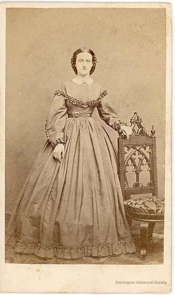 Full length standing photo of unidentified woman with left hand resting on back of chair; dress with small ruffles across bodice and white collar.Collection