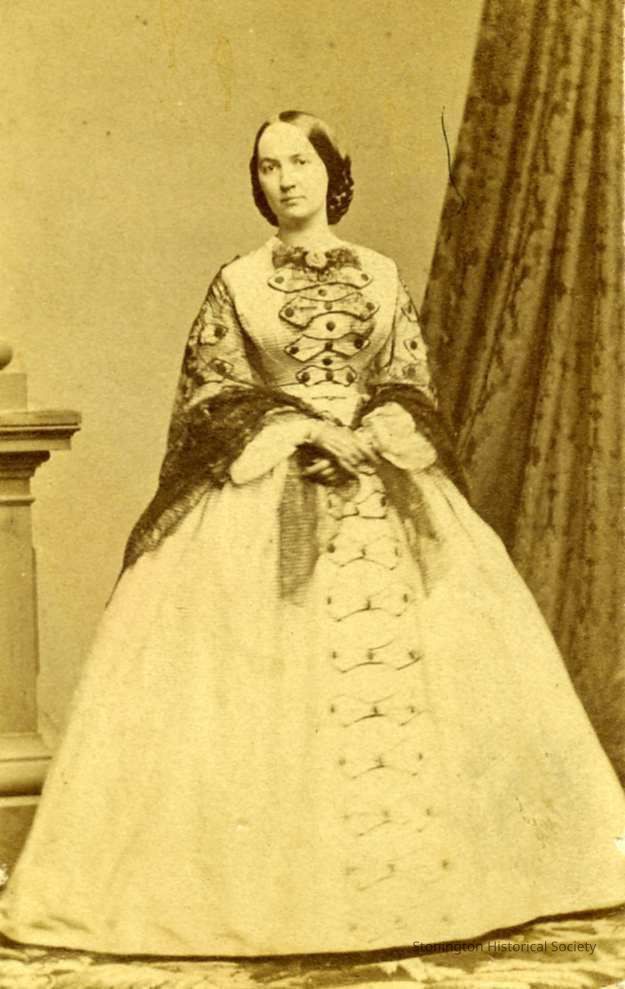 A small full length portrait photograph of Georgia Palmer Babcock, just after she married Charles Phelps Williams in 1861. She is wearing a light colored, bell-shaped gown with a shawl, and her hair in a low chignon, indicative of the Civil War period.Collection