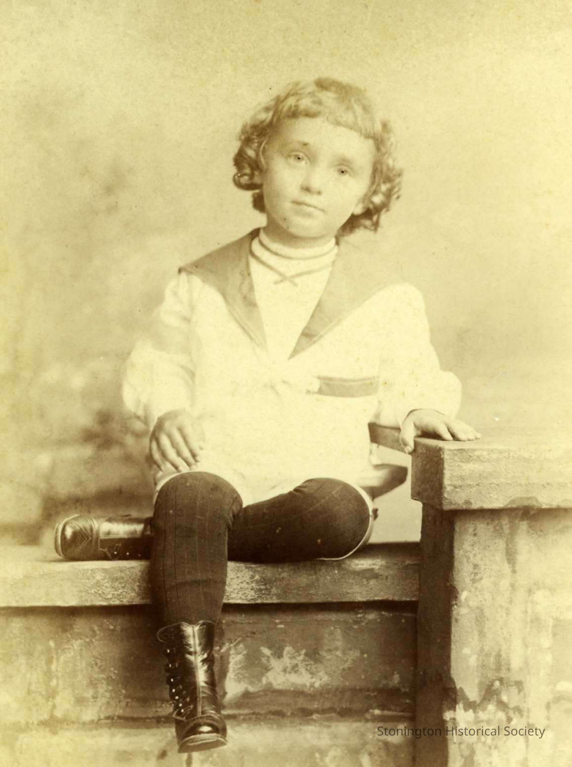 A full length portrait photograph of George Henry Warren III, at age 4. He is seated on a faux-stone prop in a white sailor's suit with black stockings. The back of the photograph is dated August 26, 1893. George Henry Warren III (1889-1971) was the son of George Henry Warren II and Georgia "Daisy" Williams.Collection