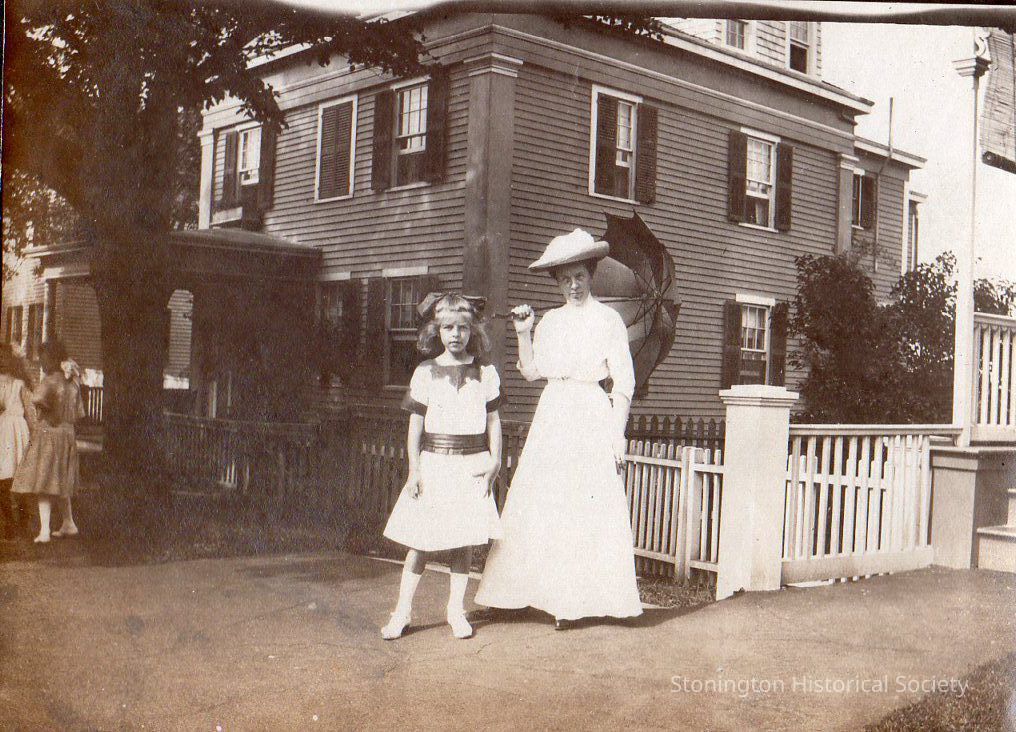 Album page with black and white photographs of Stonington Borough, c. 1910. Includes photograph of 13 Main Street, the Congregational Parsonage formerly at Cannon Square, Marjorie O'Dell at the Congregational Parsonage (holding a kitten) and Helen O'Dell with her mother, Winnifred O'Dell. Album belonged to Helen O'Dell.