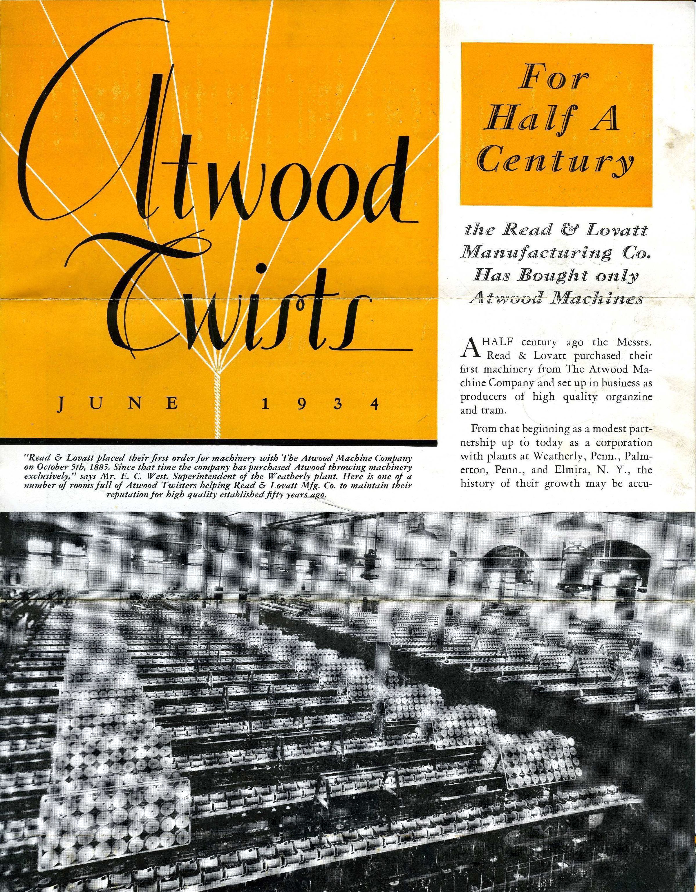 Atwood Twists company newsletter for the Atwood Machine Company, published in June 1934. Four pages. Stories include: Read & Lovatt Manufacturing Companies have bought only Atwood machines for 50 years;Accurate Twist depends on Smooth, Accurate Take-up Rolls; The New Oilless "Monarch" is the Last Word in Twisters; Railroad Schedules are One Hour Earlier; and These men and Machines Help Produce Uniform Yarn.Collection