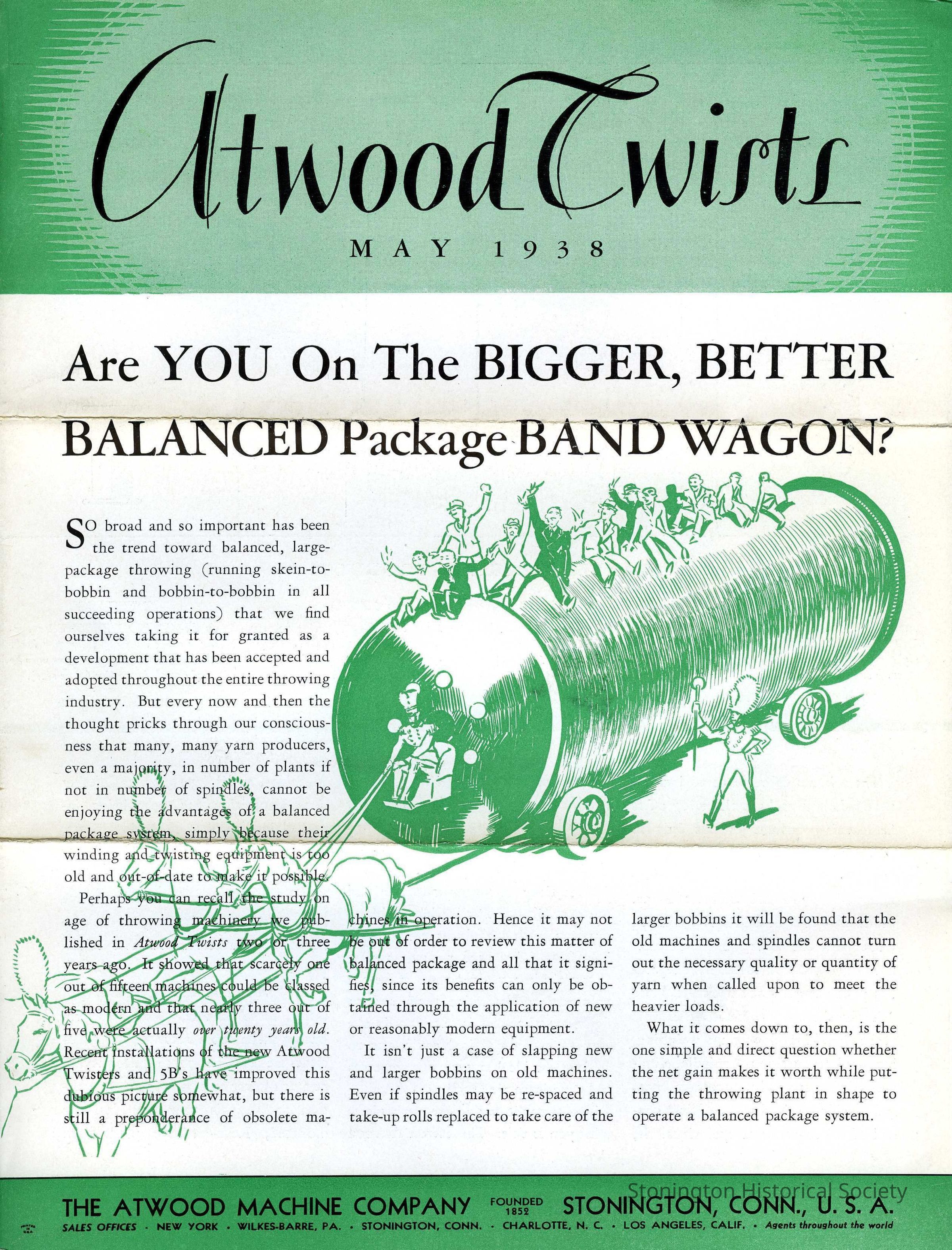 May 1938 monthly newsletter put out by the Atwood Machine Company. The four page booklet focuses on the publicity and explanation of new parts or invented machinery. Articles in this issue include: Are You on the Bigger, Better Balanced Package Band Wagon; Announcing a New Member of the Atwood Organization, William McLeod Fraser; Atwood Service from Monday Morning to Friday Night Eastern Daylight Time; an announcement for the 1938 Exposition of Silk and Rayon Throwing Machinery.Collection