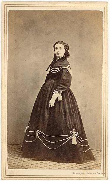 Full length standing portrait of unidentified woman, 20s-30s, pregnant, in dark dress with white cord and tassel trim