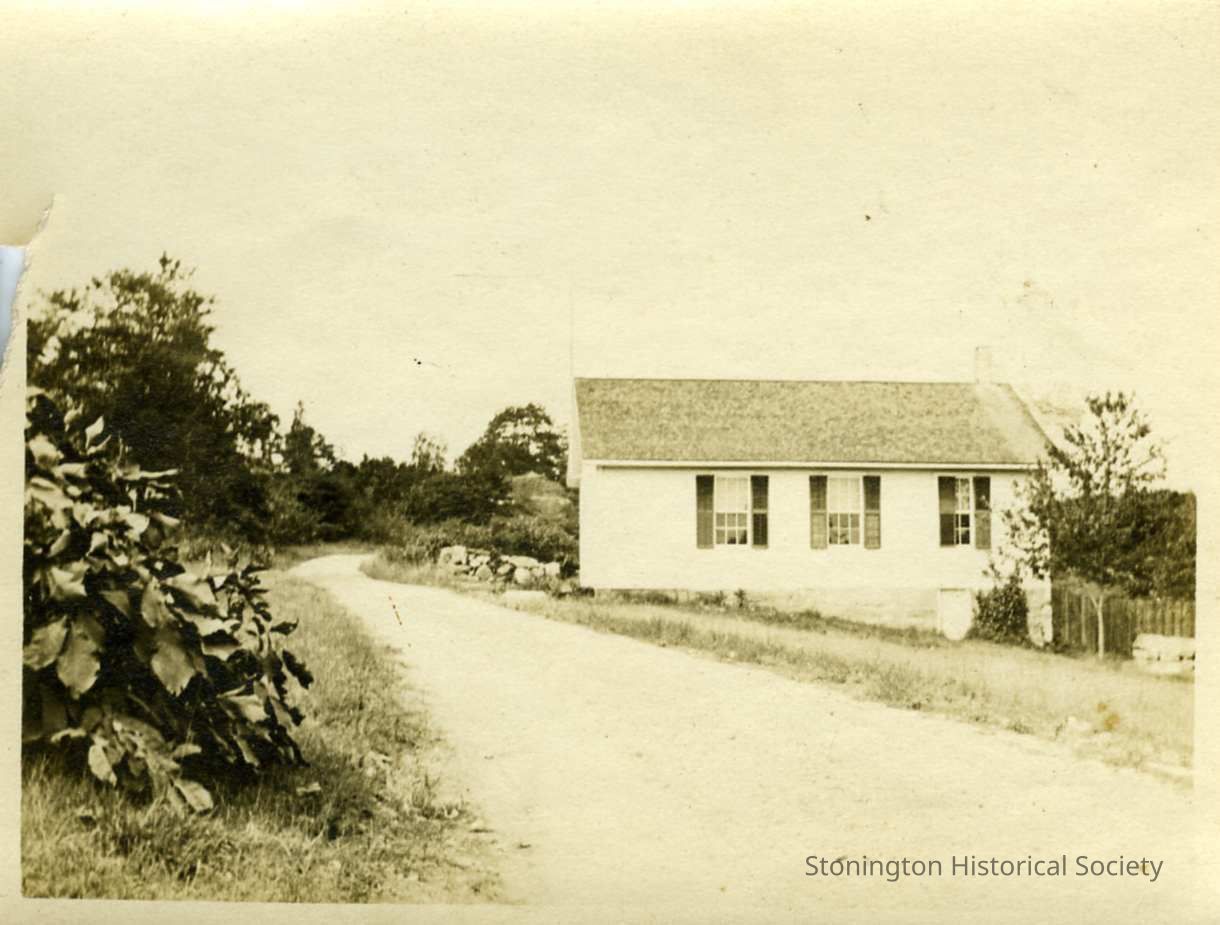 A small black and white image of a one room schoolhouse along a dirt road, most likely Cove Road. The back of the photograph reads "Schoolhouse in upper Quaimbaug where chidlren in that section and Wilcox Curve etc, went to school through the grades 1850s to 1911. Now 1950, owned by the Rathbuns and made into a house."Collection