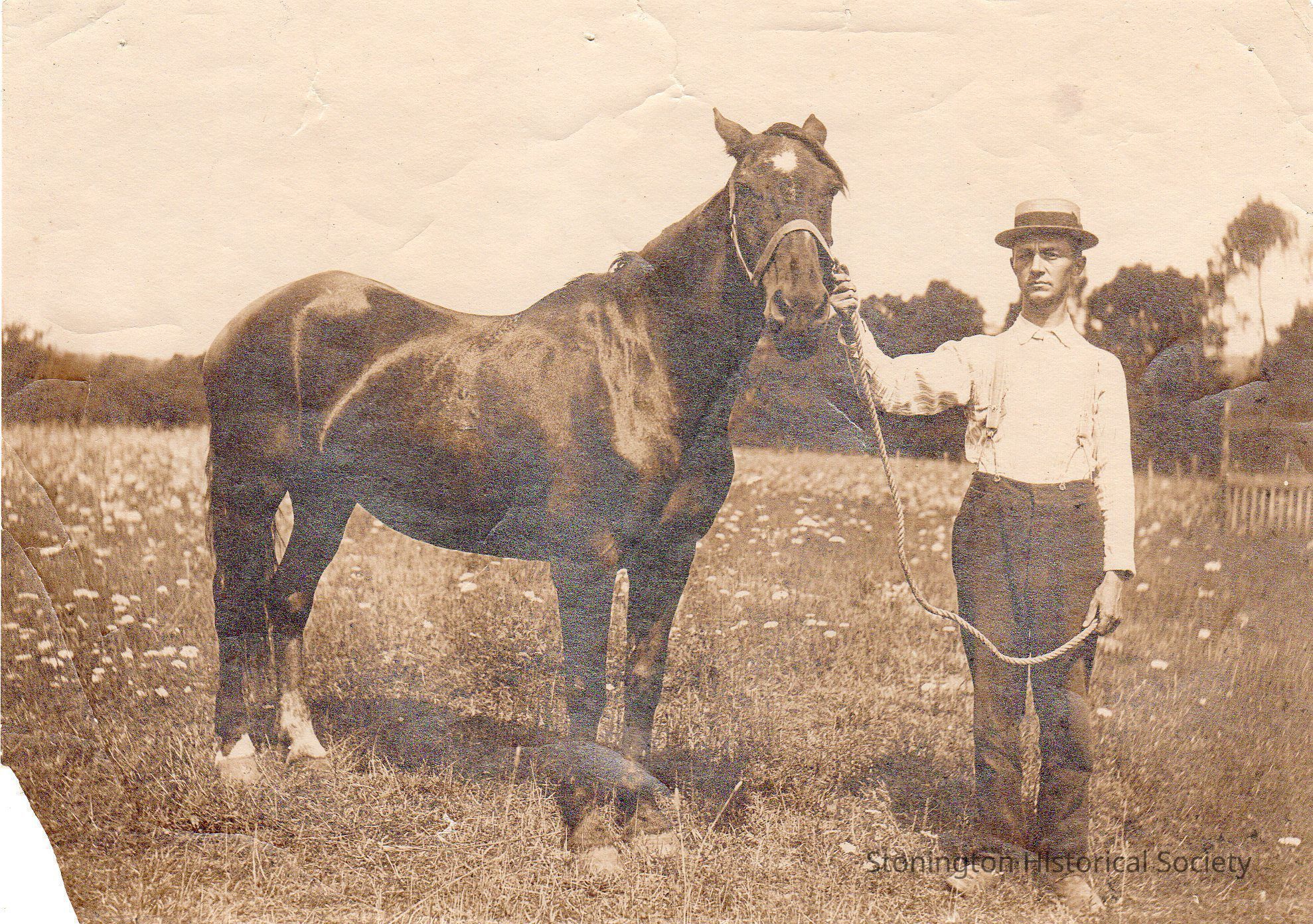 Photograph of Latham Hull with a horse, North Stonington, 1906. Found loose with Hull family Bible (2024.204.1).