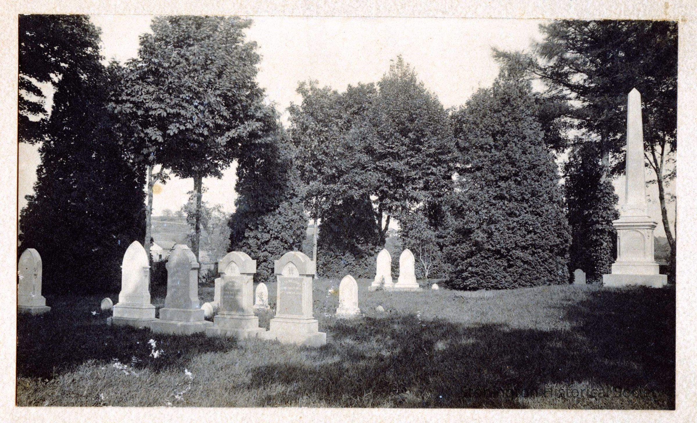 A black and white photograph of the old Williams Burying Ground on Shewville Road, taken by George E. Tingley in 1903. The photograph shows a group of stones, and a monument on the far right with a small obelisk. A farm is visible through the trees on the left. Top section reads: Am quite sure this is the old WIlliams Burying Ground on the Shewville Road just before the Morgan Farm on the corner. These stones (also the bodies) I understand were all moved (except one, whose heir or heirs would not pay for the moving, which is still there, 1958) to Elm Grove Cemetery, and are on the Williams Lot, northwest part, near the River, where now also my wife Fannie Fish Noyes and her folks are buried. Charles F. Noyes, December 21, 1958Collection