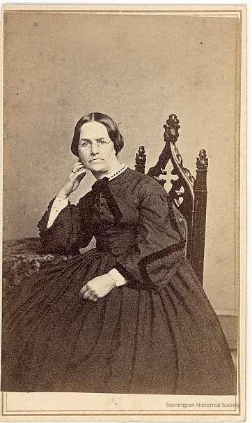 Unidentified seated middle aged woman in black dress, wearing eyeglasses