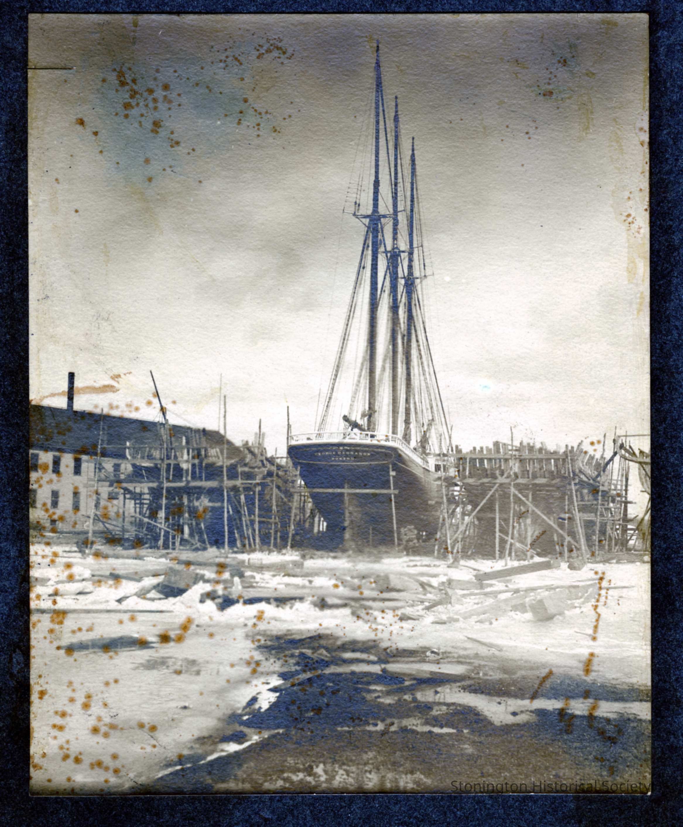 A black and white photograph pasted to a cardboard backing of a three masted ship in a shipyard. There is some foxing on the photograph. The name on the back of the ship is George Redsands, Boston.