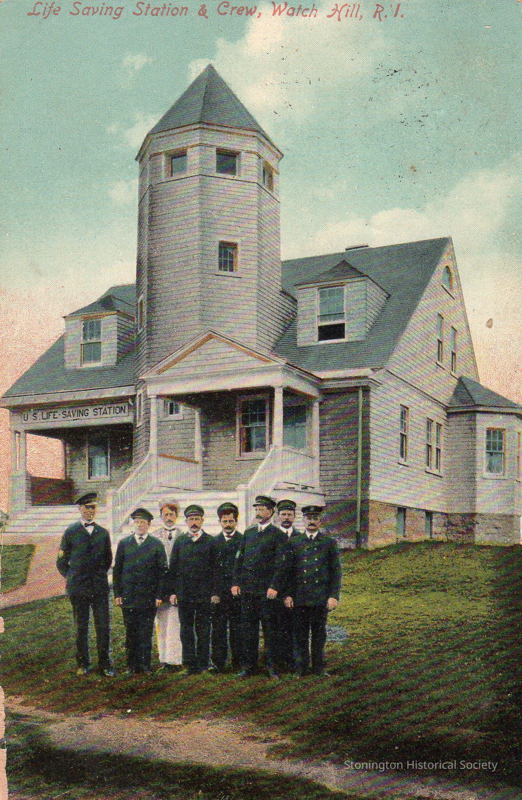 Color postcard, "Live Saving Station & Crew, Watch Hill, RI." Postmarked April 6, 1910.