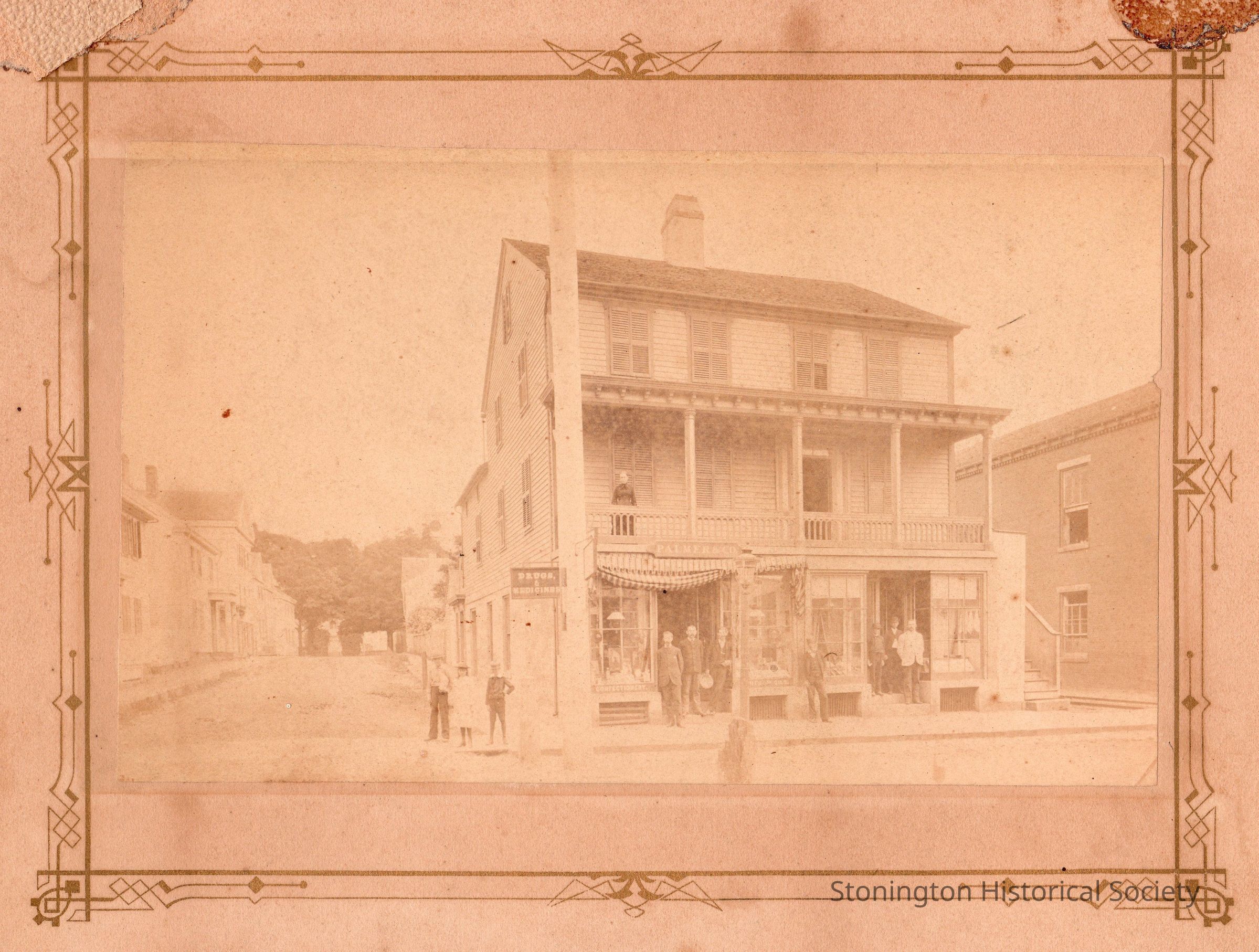 photograph, mounted on board, Palmer & Co. storefront - sold drugs & medicines, confections, ? & oils. Belonged to Ruby Parke Anderson.