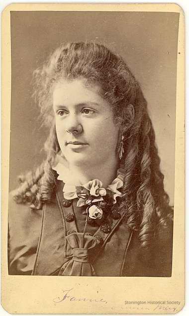 Head and shoulders photo of unidentified young woman with long cork screw curls, roses at neck, approximately 20 years old
