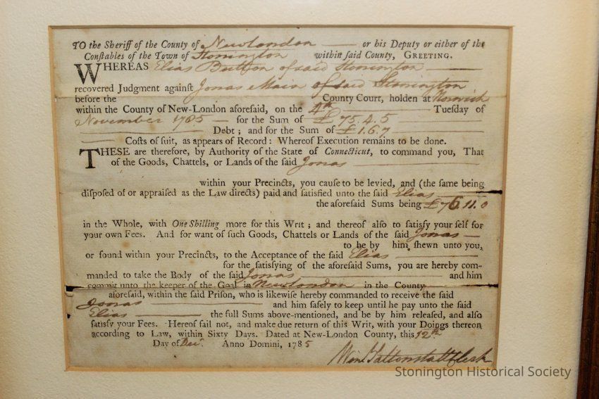 Framed and matted document dated December 12, 1785 measuring 11.25 inches by 10 inches. Document refers to judgment in a law suit by Elias Button against Jonas Main in which Jonas' property will be levied to pay for the debt owed. Signed by William Saltonstall, town clerk.
